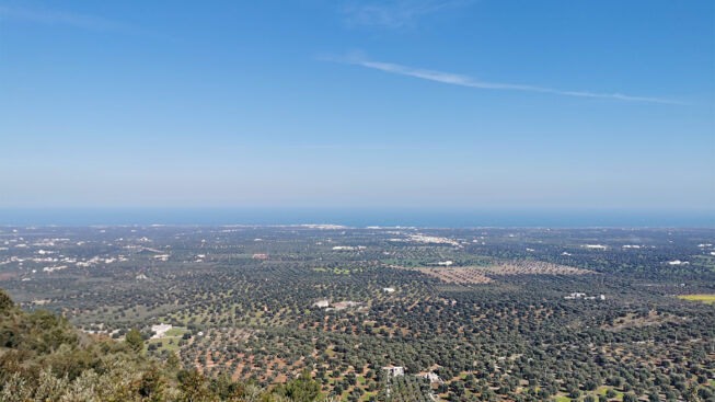 La strada provinciale n. 9 giunge ai piedi dello zoccolo murgiano e sale di 200 metri di quota in poco più di 2000 metri. Nel 1976, fu parte, cosiddetta, da montagna, del circuito dei mondiali di ciclismo che si tennero nella provincia di Brindisi, con partenza ed arrivo ad Ostuni. La rigogliosissima vegetazione è un ulteriore viaggio, nel viaggio. Al quadrivio posto alla sommità una pianta di ulivo di ben 600 anni aiuta il viaggiatore ad aumentare il senso di rispetto per una natura che qui si esalta e ti avvolge. La gran quantità di alberi primeggiano sul territorio e ne conferiscono un significativo segno di esaltazione della vita.
