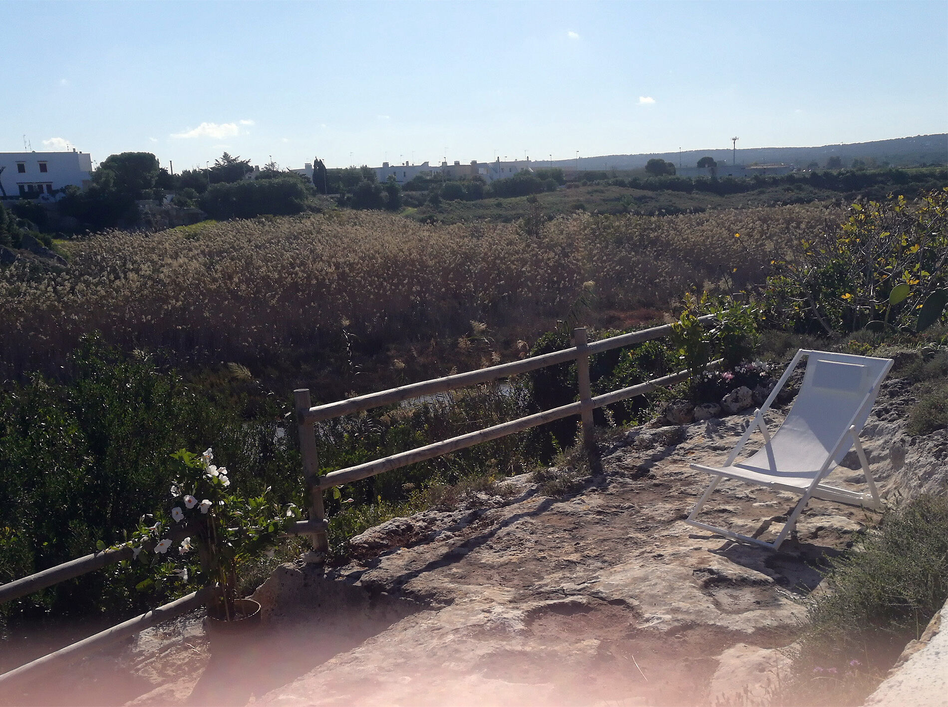 Tra le foto mi emoziona quella che mostra una sedia a sdraio, oltre il muretto di confine, dove il rischio di cadere è alto e una balaustra in legno simula protezione. Tutti ambirebbero sedere a quella sdraio e godersi l’alba sulla mezza luna, nel mentre il frignare delle cicale, il gracidio delle rane e le punture delle zanzare consigliano l’uso presidi medico sanitari per non ascoltarne il vociare e proteggersi dalle numerose punture è necessario, che di questi tempi tra virus e batteri i nemici non si contano.