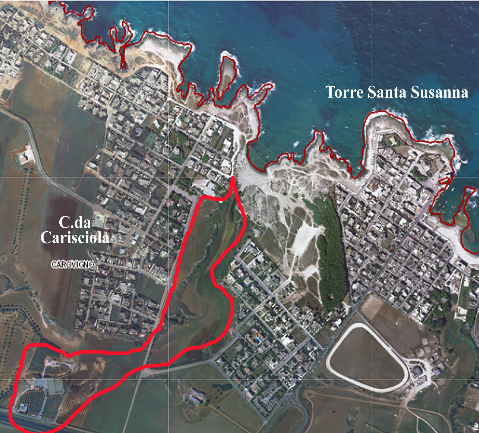 Occupa uno spazio che si insinua nella periferia settentrionale dello storico abitato di Torre Santa Sabina, in contrada Carisciola.