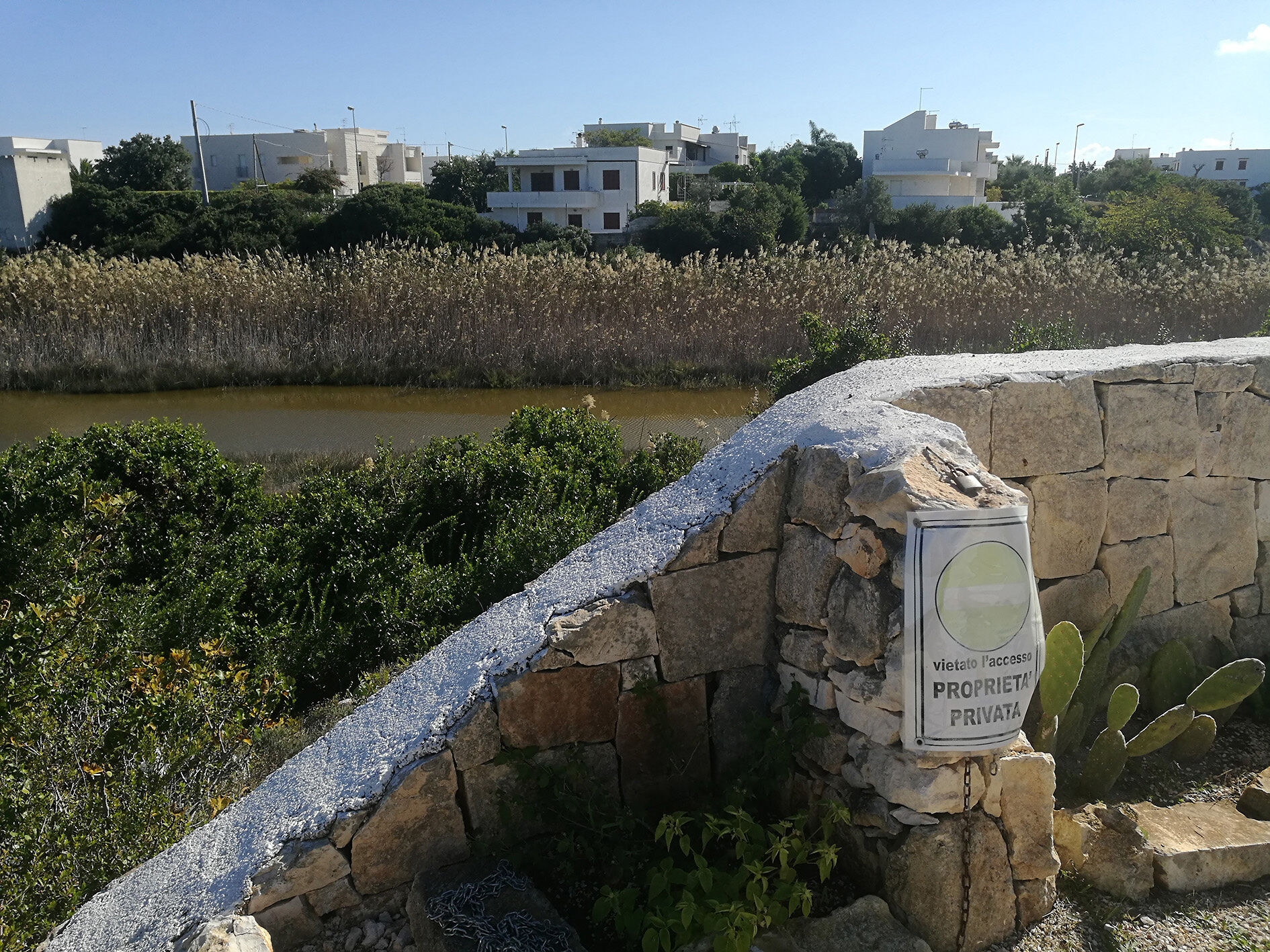 C’è chi parlò di ecomostro e chi adì le vie legali, la risultante è sotto gli occhi di tutti, le villette, tutte bianche e come soldatini in riga, mostrano la loro efficacia abitativa, ma restano orfane e un po’ sole, per non avere come amiche le aree dell’invaso le cui pareti, maestose e bianche, pure esse, restano nascoste dal rigoglìo di un canneto gigantesco e dal ristagno d’acqua che non defluisce al mare, che pure la foce, non esiste un perché, senza far polemica, sfocerebbe, ma non lo fa, nella spiaggia che ha ricevuto pure per diversi anni il riconoscimento di bandiera blu.