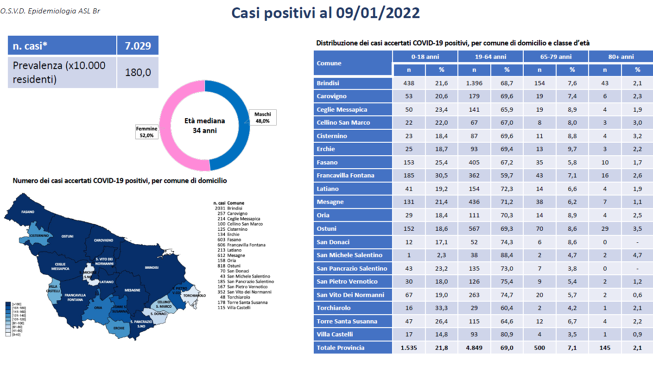 Per quanto riguarda la distribuzione per Comune i positivi sono 2.031 a Brindisi, 818 a Ostuni, 612 a Mesagne, 606 a Francavilla Fontana, 603 a Fasano, 352 a San Vito dei Normanni, 257 a Carovigno, 214 a Ceglie Messapica, 213 a Latiano, 185 a San Pancrazio Salentino, 178 a Torre Santa Susanna, 167 a San Pietro Vernotico, 158 a Oria, 134 a Erchie, 125 a Cisternino, 115 a Villa Castelli, 100 a Cellino San Marco, 70 a San Donaci, 48 a Torchiarolo, 43 a San Michele Salentino. I Comuni della provincia di Brindisi con i maggiori valori di incidenza cumulativa sono, nell’ordine, Brindisi, Torre Santa Susanna, Francavilla Fontana, Torchiarolo.