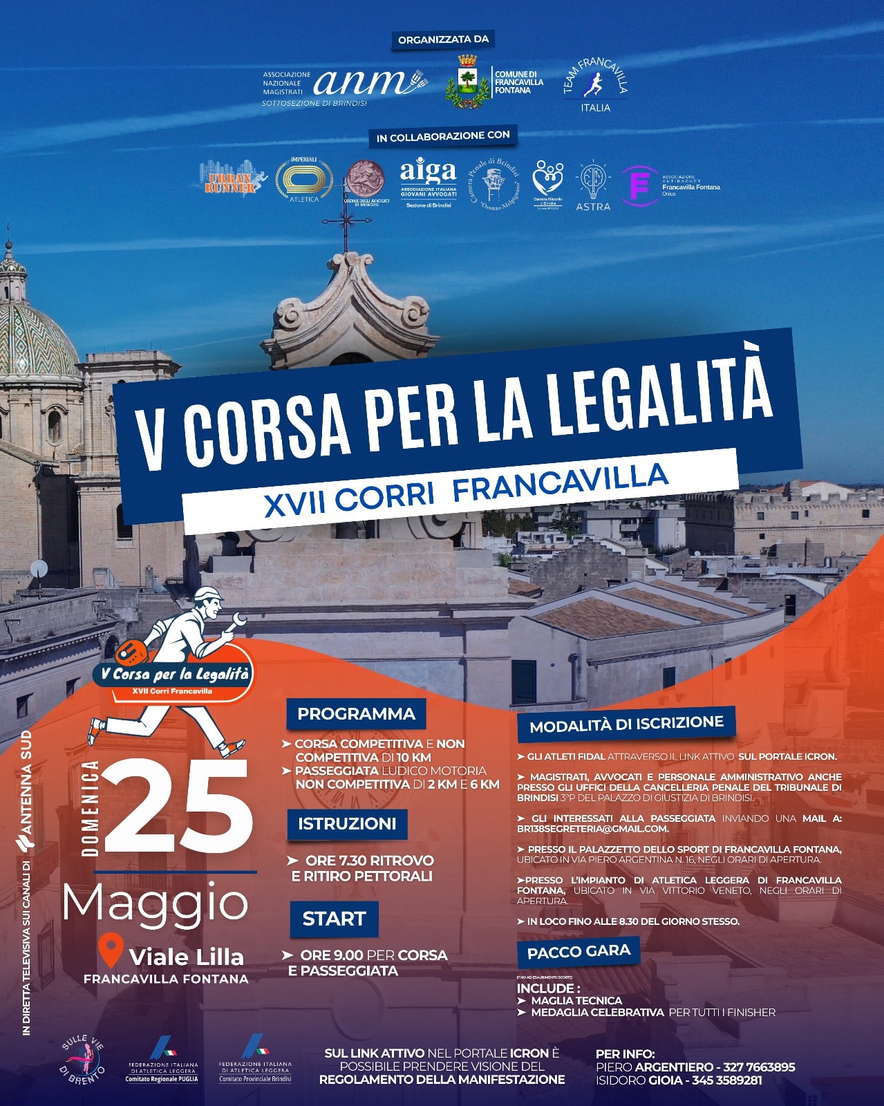 Domenica 25 maggio Francavilla Fontana sarà invasa pacificamente da centinaia di atleti provenienti da tutta la Puglia per la quinta edizione della corsa per la legalità che si svolgerà nell’ambito della XVII Corri Francavilla, la competizione podistica organizzata da Asd Team Francavilla in collaborazione con Urban Runner e Imperiali Atletica.