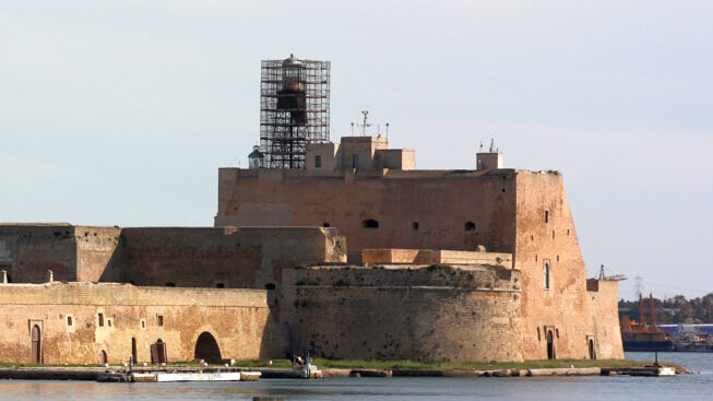 Di tipologia insolita, sia per la geometria che per l’ubicazione, anche il faro di Punta Riso, una struttura fatta realizzare dalla Commissione dei Porti e attivato nel 1893 per segnalare la presenza dell’isola di Sant’Andrea, a nord del porto esterno della città, con una lampada di IV ordine a luce bianca a splendori e intervallo tra i lampi di cinque secondi. Alcuni anni dopo fu realizzato lo scalo di alaggio per le barche dei fanalisti e il pontile in legno in legno e ghisa, lungo 210 metri, che lo collegava all’isola. Dal 1931 divenne un fanale a luce verde a lampi e nel 1952 viene installata una nuova lanterna metallica utile ad ospitare le apparecchiature di V ordine. Sette anni dopo la tipica torretta bianca alta dodici metri venne rivestita con “tesserine maiolicate bianche e nere, da venti millimetri, che compongono strisce orizzontali alterne, due nere e una centrale bianca” ricorda l’architetto Chiara Sasso, autrice di alcuni interessanti studi sulla conservazione del patrimonio industriale e paesaggistico pugliese. Ai piedi della torretta vi è un caratteristico basamento circolare utilizzato in passato come ambiente di servizio, affiancato da altri due locali indipendenti “mai utilizzati né come alloggio né come deposito dai faristi, per l’eccessiva umidità”. L’intera struttura è realizzata da conci di carparo locale “in una variante rossastra”, gli stessi usati per il Castello Aragonese (per questo è detto anche Castello Rosso), con i blocchi cavati nei pressi della struttura, dove si notano ancora i numerosi scogli squadrati e tagliati. Lo specchio d’acqua che separava il faro dall’isola venne colmato nel 1985 durante la costruzione della lunga diga foranea (2.385 m.), al quale oggi il faro rimane sottoposto, ciò ha determinato la dismissione della struttura con il trasferimento dell’ottica su una nuova torre poco distante, spenta definitivamente alcuni anni dopo, e la demolizione della parte nord della fabbrica “compromettendo l’integrità formale e volumetrica e restituendone un’immagine menomata”.