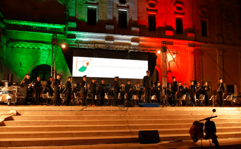 Il bellissimo prospetto della Chiesa di San Domenico diventa lo sfondo di una realtà rara ed emozionante, il concerto della fanfara dell’Aeronautica Militare Italiana.