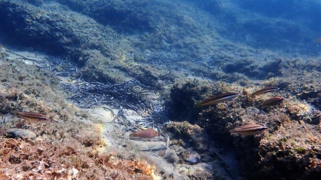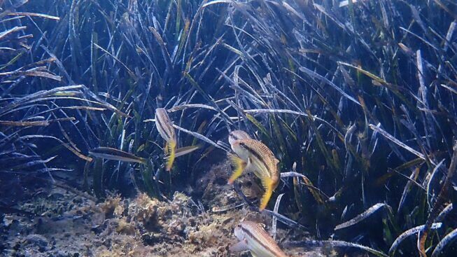 Gruppetti di giovani occhiate, che sorvolano i ciuffi di Posidonia, si incrociano con banchi di salpe dalla caratteristica livrea a strisce orizzontali argento ed oro. Un grosso Paguro bernardo si inabissa fra le foglie, mentre i suoi occhi sporgenti continuano a fissarci, più con curiosità che con paura.