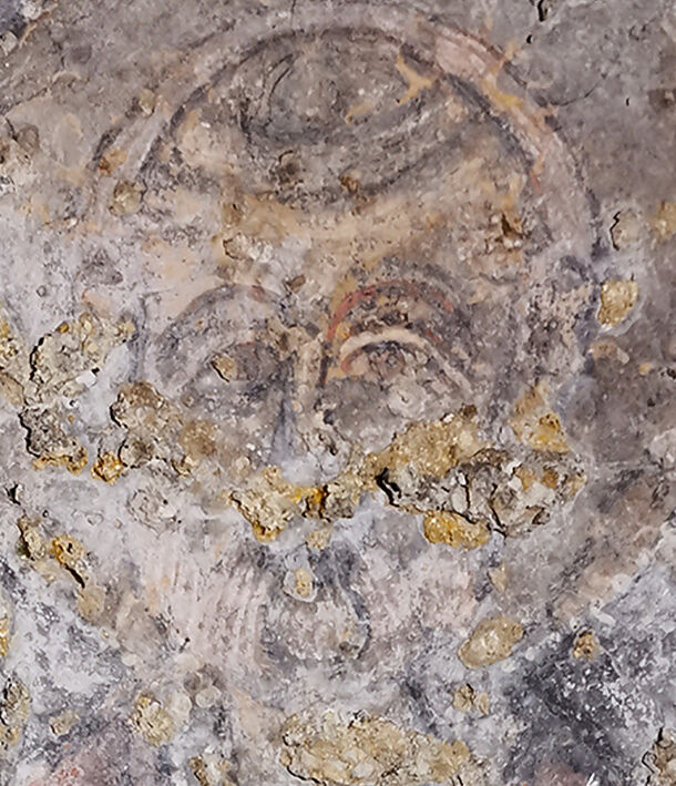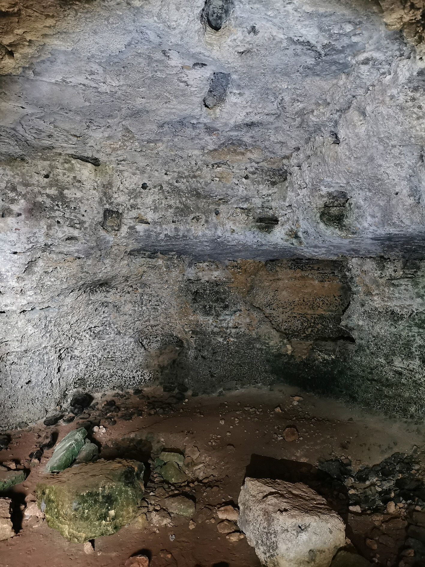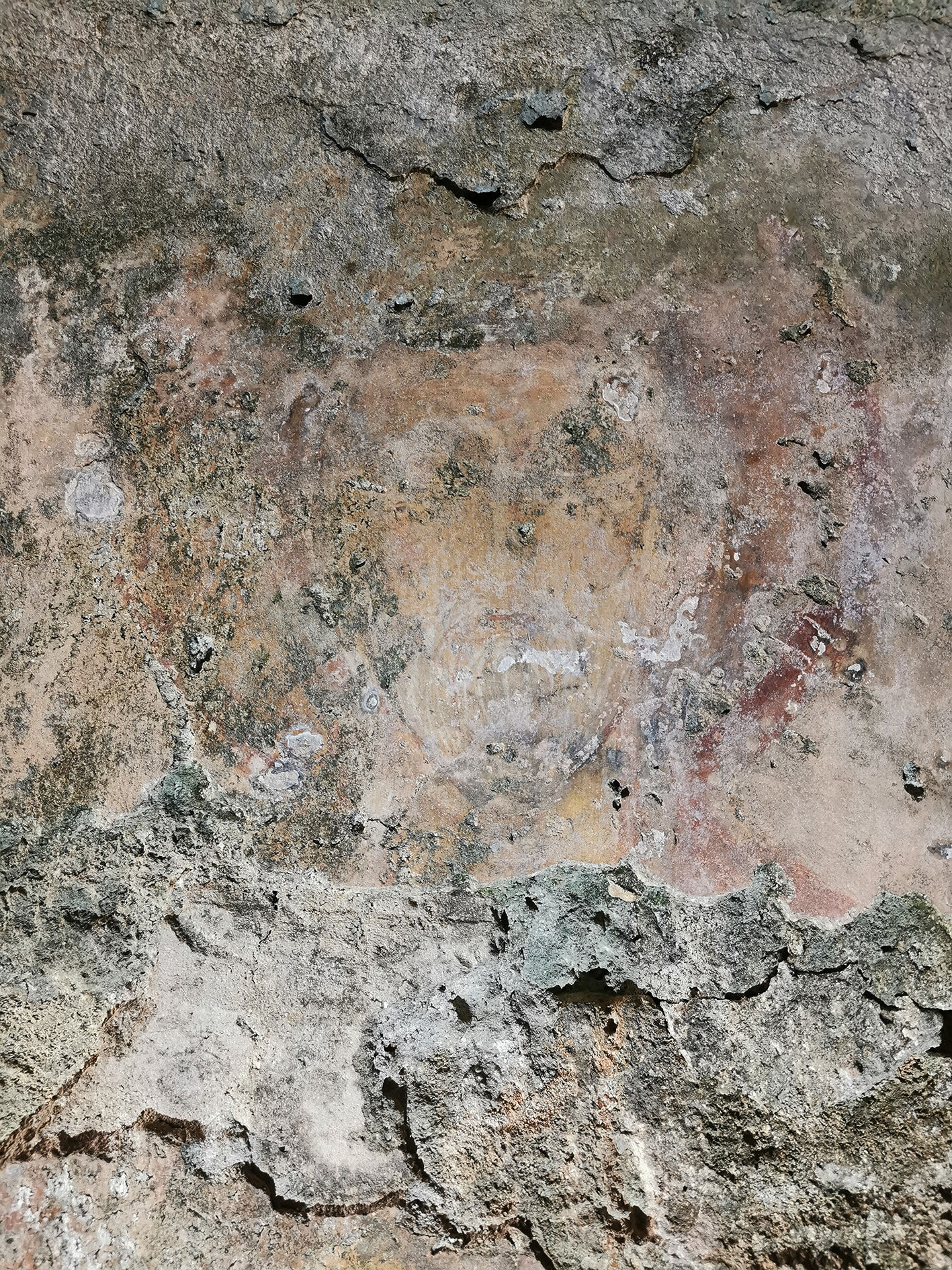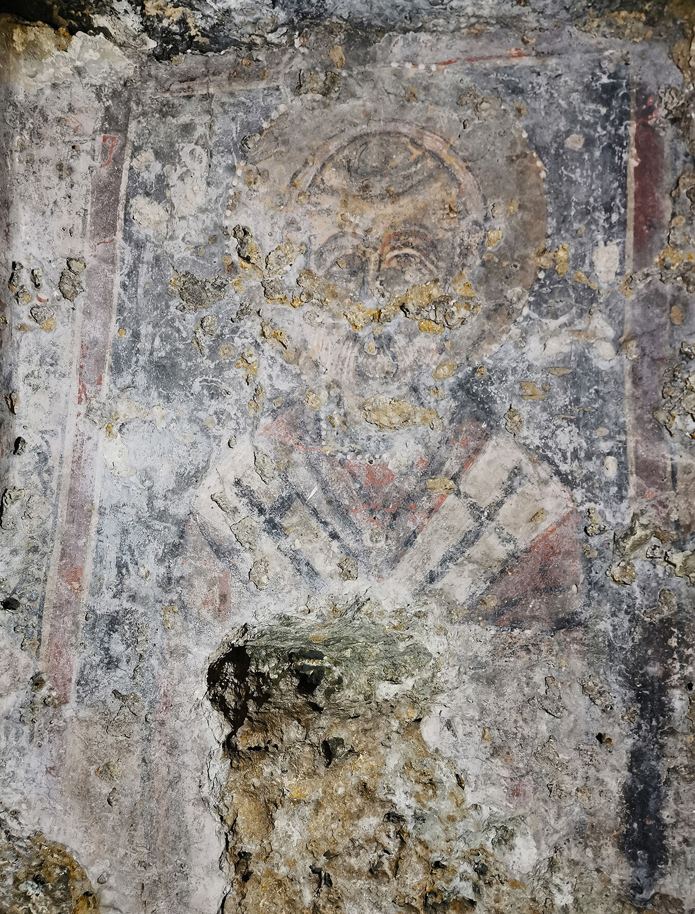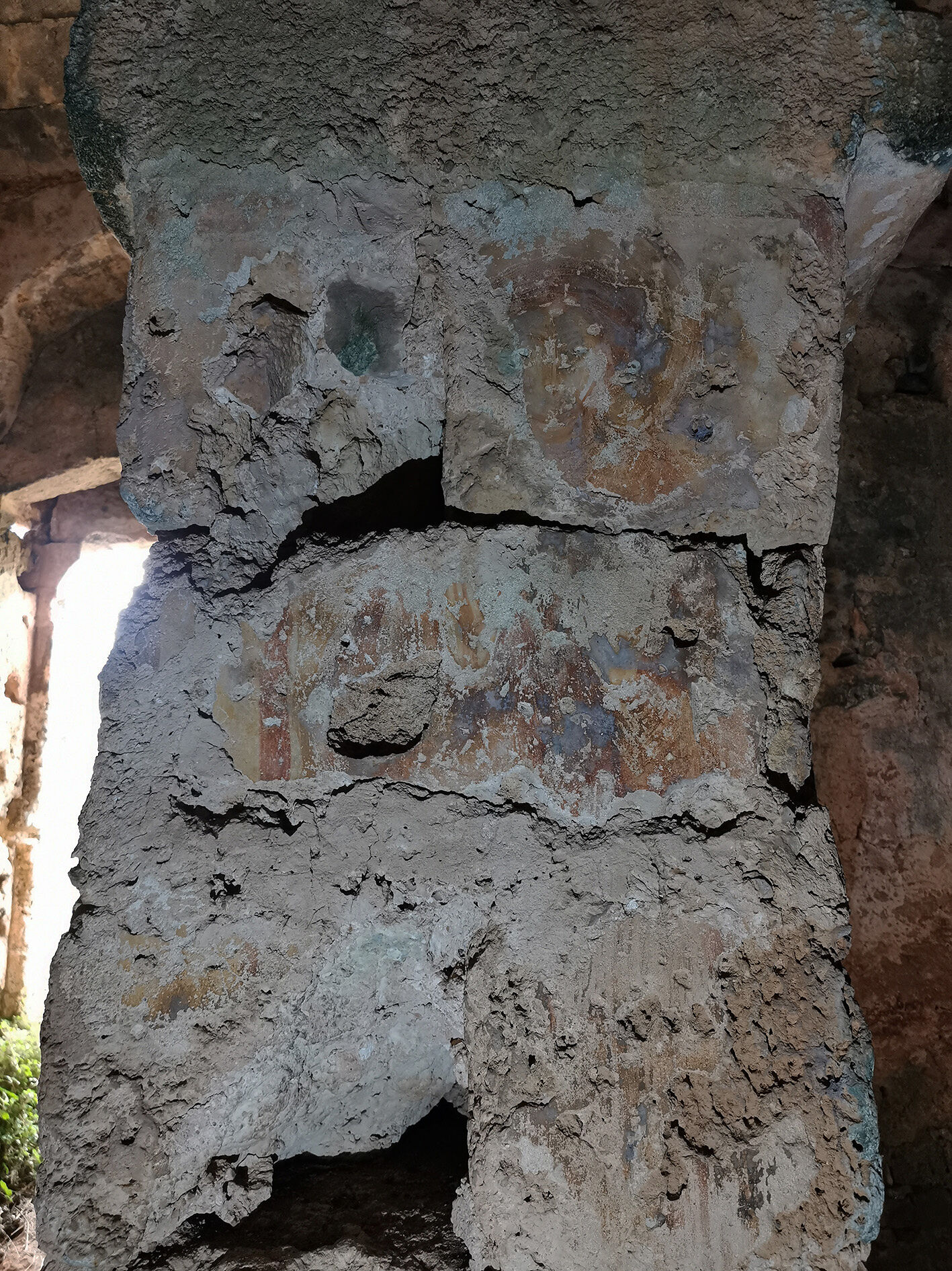 Occorre fermarsi e guardare con attenzione, magari muniti di torcia, per notare che sull’unico pilastro in tufo che presiede la cavità si notano tra le macerie, i resti di due affreschi, uno forse riguardante un Cristo e l’altro il volto di una donna che definirla come una madonna è un rischio che non voglio correre.