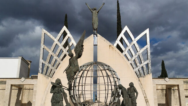 Lo sguardo e l’attenzione corre subito al bel gruppo scultoreo che presiede l’ingresso al cimitero comunale, opera superba del maestro latianese Carmelo Conte, che invita a perlustrare una prospettiva che unisce la vita terrena, le sue miserie, la sua caducità, con il simbolo della universale istanza di speranza che trionfa su tutto.