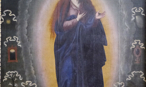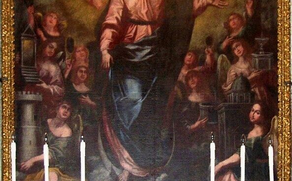 L’immagine sacra di Maria Immacolata nella nostra città è altresì presente su due interessanti tele del XVII secolo: la prima è conservata nell’Episcopio, l’altra è nell’omonima cappella della chiesa di Santa Maria degli Angeli, entrambe di autore ignoto. La Vergine è sempre raffigurata con i suoi tradizionali elementi iconografici: una donna bellissima circondata dalla luce di Dio, con la mezzaluna calante ai suoi piedi, segno della purezza che contrasta l’impero delle tenebre, nell’atto di schiacciare il serpente, simbolo e figura del diavolo, a significare l’inequivocabile vittoria del bene sul male.