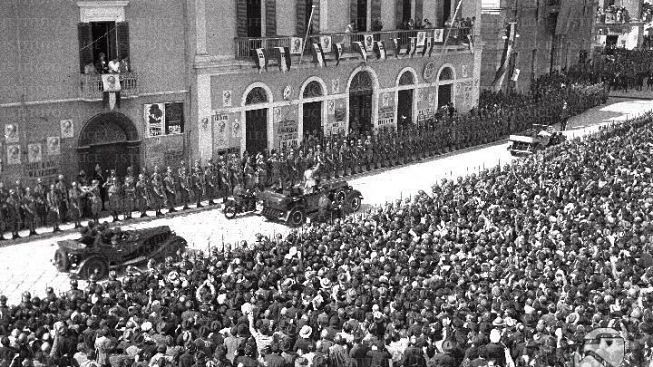 Dopo aver passato in rassegna i reparti della Marina e dell’Esercito, il Duce salì sull’automobile decappottabile per dirigersi a Palazzo Montenegro; il corteo percorse lentamente il lungomare accolto dalle acclamazioni della folla riunita ai lati della strada, e prima di giungere a destinazione si rispettarono due soste, la prima a piazzetta Dionisi, dove Mussolini depose una corona di alloro davanti al Monumento ai Caduti realizzato da Edgardo Simone, quindi poco più avanti, dinanzi alla scalinata delle colonne, dove erano schierati ottocento piccoli balilla pronti ad intonare l’inno a Roma, che il leader del Partito Fascista ascoltò in piedi prima di proseguire e giungere a destinazione.