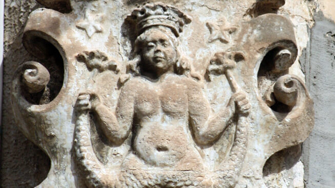 Merita una breve descrizione questa figura femminile antropomorfa molto diffusa in epoca medievale, che trova ampio riscontro anche in contesti più antichi. La Melusa, o sirena bifide, è una creatura marina insolita e misteriosa, rappresentata con le gambe pinnate divaricate come a mettere in evidenza la parte intima femminile, la sua raffigurazione costella arcate, capitelli e portali di moltissime chiese, monasteri e conventi italiani ed europei, un simbolo particolarmente presente lungo la via Francigena tanto da essere considerata come una guida per i pellegrini. L’immagine della sirena ammaliatrice “che consola e inganna“ suscita da sempre polemiche e discussioni tra gli studiosi per l’attribuzione del suo significato, una figura mitologica che per secoli ha offerto svariate interpretazioni, soprattutto in chiave religiosa: trattasi, secondo una tesi tra le più accreditate, di una delle testimonianze del passaggio dal paganesimo al cristianesimo, in particolare del culto della fertilità dionisiaca molto sentita nelle aree agricole e pastorali, dove la sirena rappresenterebbe la dea della prolificità e delle acque, protettrice del creato, divenendo quindi simbolo di fecondità. La rappresentazione nel corso dei secoli si è ulteriormente evoluta senza però perdere la sua originale simbologia uterina a garantire l’atavico culto legato alla procreazione. La presenza di questa immagine carismatica sull’architettura privata è anche legata all’immaginario degli uomini, in quanto elemento apotropaico capace di allontanare le forze maligne e proteggere la famiglia e la propria dimora, assicurando alle giovani coppie la procreazione.
