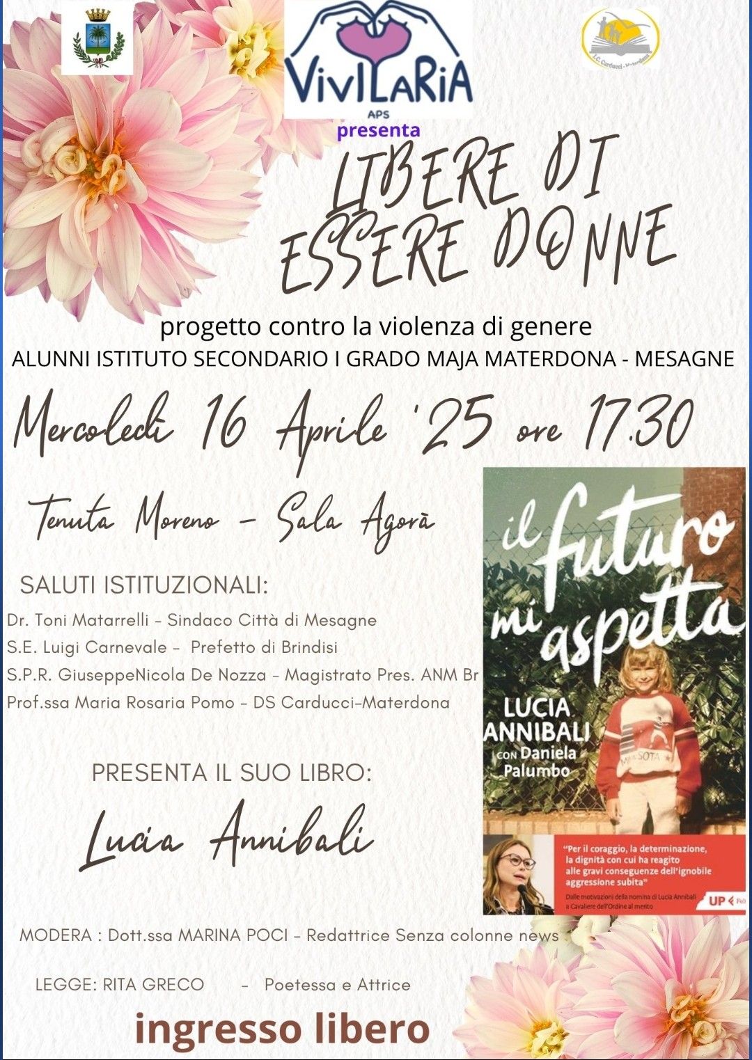 Mercoledì 16 aprile, alle ore 17:30, presso la Sala Agorà di Tenuta Moreno, a Mesagne, VivIlaria aps (associazione di promozione sociale sorta in memoria di Ilaria Scianaro) presenta l’evento di restituzione del progetto scolastico “Libere di essere donne”, realizzato per sensibilizzare le nuove generazioni sulla violenza di genere e sostenuto dall’Istituto Comprensivo Carducci -Materdona di Mesagne. L’iniziativa, aperta a studenti e docenti, famiglie, istituzioni e liberi cittadini che vorranno essere presenti, vedrà la partecipazione dell’Onorevole Lucia Annibali, avvocata e scrittrice, attualmente difensora civica della Regione Toscana, che presenterà il suo ultimo libro, “Il futuro mi aspetta”, racconto lucido e appassionato della sua vita dopo l’aggressione con l’acido, subita per mano di due uomini assoldati dal suo ex compagno.