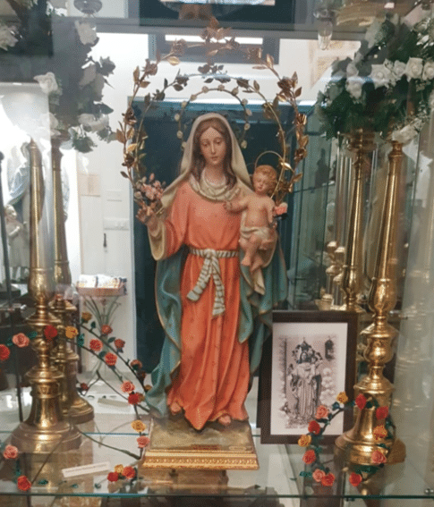 Degna di nota è anche la testa della prima statua della Madonna del Giardino, donata nel 2020 alla parrocchia dalla famiglia di Franco Leuci: fatta restaurare, poggiata su un sostegno e custodita in una teca singola, costituisce l’unica parte del manufatto salvatasi dalla furia degli iconoclasti (il cui modus operandi, per cancellare le tracce della fede, era appunto quello di mozzare la testa alle statue sacre). Accanto all’opera, c’è l’ingrandimento di una rarissima fotografia, con ogni probabilità riconducibile ai primi anni del Novecento, che raffigura la statua per intero, così che i visitatori abbiano l’esatta percezione di come fosse all’epoca.
