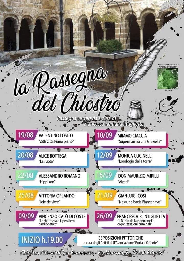 “La Rassegna del Chiostro nasce dalla esigenza degli autori di piccola e media editoria di potersi presentare nella città di Brindisi. Nasce dalla volontà di condividere momenti pregni di contenuto e dialogo, dopo le chiusure forzate dovute alla pandemia. Nasce anche dalla volontà di creazione di una rete di collaborazione tra autori, lettori e pittori della associazione Porta d’Oriente, i quali pittori stanno esponendo, in ogni sera di Rassegna, una loro opera pittorica che abbia gli stessi temi dei libri presentati. Difficile sicuramente per l’assenza di supporti economici poiché autofinanziata, ma fortunatamente moralmente supportata dalla presenza di tante persone amanti della lettura e dell’arte, in generale. Infatti, gode anche dell’affiancamento dei soci volontari del Touring Club Italiano di Brindisi. Tante le tematiche oggetto di dialogo e condivisione. Dal romanzo storico, alla poesia, alla saggistica, fino al teatro. Gli autori, i moderatori, i pittori e i volontari del Touring Club sono stati sin da subito solerti e attenti nelle risposte volte alla costruzione dell’evento. Così come le disponibilità della rettoria della chiesa di San Benedetto e del parroco del Duomo di Brindisi”.
