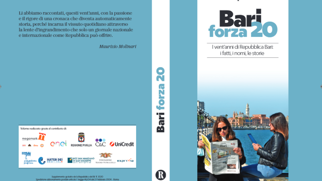 Repubblica Bari compie vent’anni e festeggia regalando un libro in cui si racconta un pezzo di storia della città e della regione attraversato dal giornale con la sua comunità di lettori. “Bari forza 20. I vent’anni di Repubblica Bari: i fatti, i nomi, e storie” è il titolo del volume che sarà distribuito gratuitamente insieme alla copia del giornale mercoledì 18 novembre.