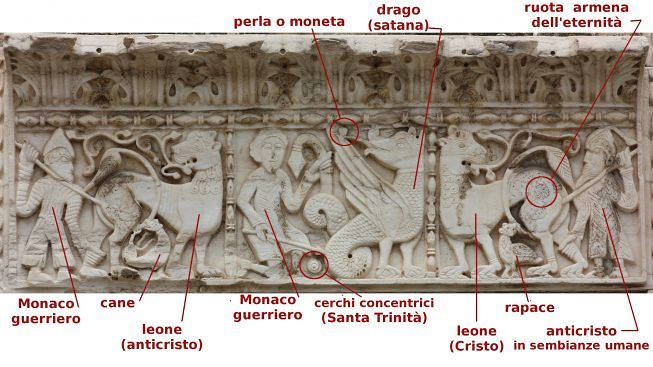 Sintetizzando, gli episodi figurativi rappresentati sull’architrave, ricchi di elementi presenti nelle Sacre Scritture, avrebbero principalmente lo scopo di indicare la strada per giungere alla salvezza spirituale, “spronando il cristiano a indossare l’armatura di Dio per opporsi all’anticristo (scena a sinistra), a resistere alle tentazioni del maligno (scena centrale) e a confidare, nelle avversità e nell’apparente sopraffazione del male (metopa a destra), nella salvezza offerta da Cristo e alla vita eterna”.
