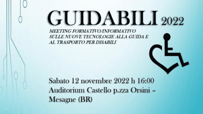 Italiabile Vivere Senza Barriere e Autofficina Serinelli (Centro Revisioni di Torchiarolo BR), presentano “GUIDABILI 2022 – Meeting formativo e informativo sulle nuove tecnologie alla guida e al trasporto per disabili” sabato 12 novembre 2022 ore 16:00 presso l’auditorium Castello in piazza Orsini a Mesagne.