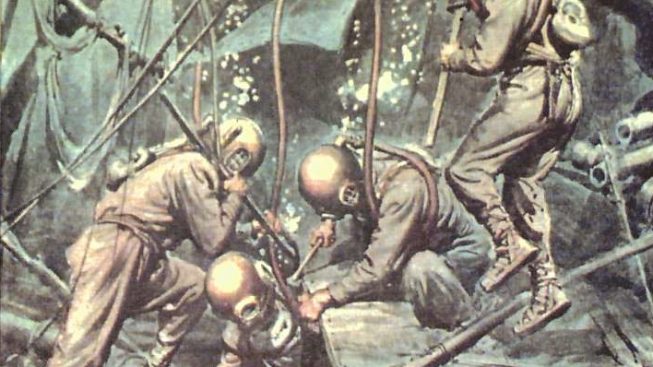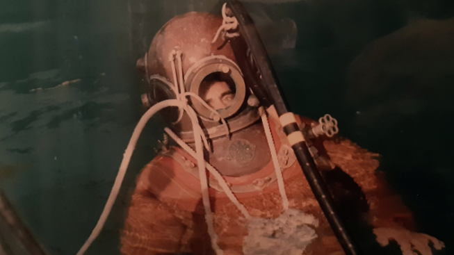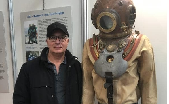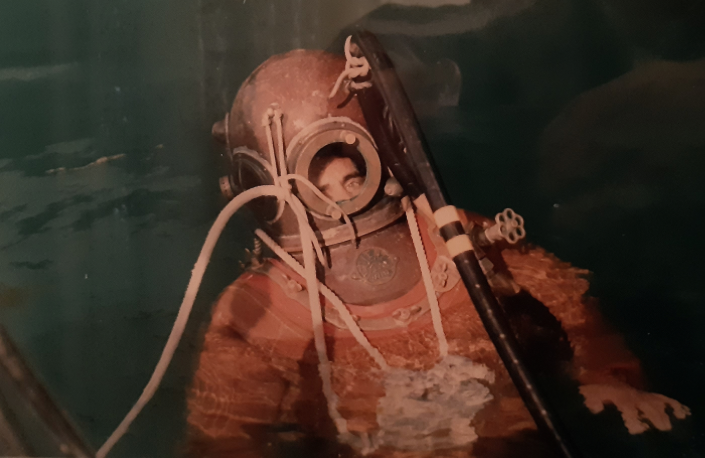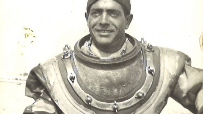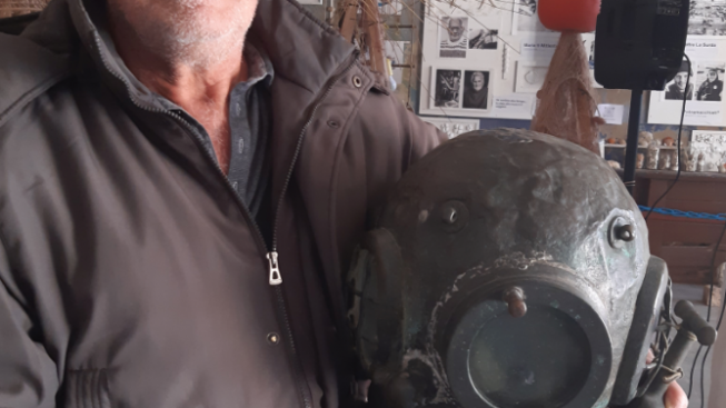 Una inedita ricerca sui palombari civili brindisini è stata avviata da qualche tempo dall’instancabile Franco Romanelli, un lavoro paziente che ha prodotto al momento solo una ventina di nomi, probabilmente meno di quanti in realtà esercitavano l’immersione nei fondali marini sin dalla metà dell’Ottocento, cioè da quando ha cominciato a radicarsi la tradizione palombaristica nazionale. Tra i loro nomi compare anche quello di suo nonno Vincenzo Guadalupi, primo utilizzatore dell’originale elmo in rame passato poi a Domenico “Mimmi” Greco, e da lui al figlio Tonino, l’ultimo a praticare quest’arte sui fondali brindisini. L’elmo, così come lo scafandro tutt’ora custodito ed esposto nel “Museo delle Sciabiche”, venne indossato da “Vincenzi” durante il recupero di alcune parti della corazzata Benedetto Brin, affondata nel 1915 nel porto medio di Brindisi. Una volta dismesso, il prezioso oggetto metallico è stato preservato con tanto amore da Tonino Greco, l’ex palombaro – da alcuni anni in pensione – sa di possedere un reperto unico, quasi raro, un pezzo di storia “sommersa” della sua città. A soli diciannove anni ottenne il suo brevetto (n. 1067) presso il noto Centro Subacqueo della Marina Militare di Varignano (La Spezia), la principale scuola di riferimento nazionale per palombari attiva sin dal 1869, già frequentata dal padre Mimmi e da tanti altri specialisti italiani delle immersioni. Per oltre vent’anni Tonino ha lavorato, calandosi sul fondo, presso l’Arsenale della Marina di Brindisi occupandosi principalmente della messa a secco dei natanti militari, mentre le operazioni dei più anziani palombari brindisini miravano soprattutto al recupero del materiale bellico inesploso dai relitti affondati, e in alcuni casi anche alla realizzazione di opere di “edilizia subacquea” e di pesca in profondità.
