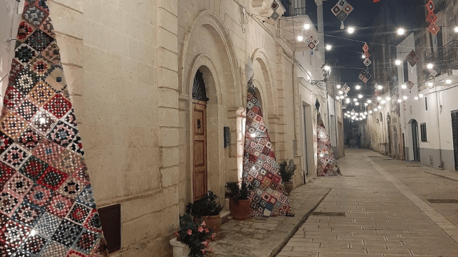Una collaborazione per queste festività natalizie che è solo un prolungamento dell’iniziativa cominciata d’estate quando, a rendere questo scorcio del centro storico del paese magico, c’erano grandi centrini ricamati a mano appesi.