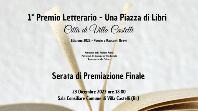 Villa Castelli On Line Aps, in collaborazione con la Libreria Francavillese e l’Associazione di Promozione Sociale Estia, è lieta di annunciare il 1° Premio Letterario “Una Piazza di Libri” – Città di Villa Castelli, dedicato alla poesia e ai racconti brevi. L’evento di premiazione si terrà il 23 dicembre 2023 alle ore 18 presso la Sala Consiliare del Comune di Villa Castelli (Br). Saranno premiati i primi tre posti della sezione poesie e racconti brevi, ulteriormente suddivisi in categoria giovani e adulti.