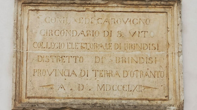 Una targa poco evidente, nei pressi del “calvario” risalente al 1862 recita che Carovigno è Comune del Circondario di San Vito, Collegio Elettorale di Brindisi, distretto di Brindisi, provincia di Terra d’Otranto.