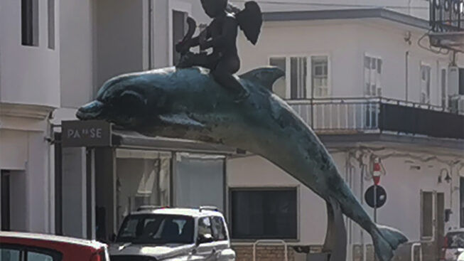 Il secondo rappresenta lo stemma cittadino, un delfino cavalcato da un amorino che suona la cetra. La mitologia vuole trattarsi di Arcione, figlio di Poseidone re dei mari, correndo il rischio di morire assassinato, suonò il suo strumento, durante la navigazione da oriente verso la Magna Grecia. Un gruppo di delfini lo scortò a riva sano e salvo. A lui si richiamano molte città rivierasche, tra queste, Carovigno.