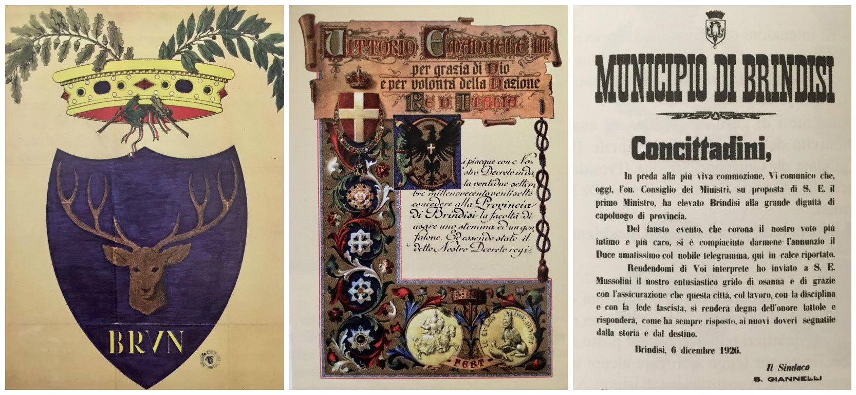 La storia repubblicana, forse ci obbliga a rigenerare il nostro concetto di territorio di riferimento. Forse vedremo cancellato dalla dignità di vessillo provinciale lo stemma che fu concesso alla Provincia di Brindisi dal re Vittorio Emanuele III con decreto del 22 settembre 1927, e che a memoria dei posteri fu così descritto in un “solenne documento” del 4 marzo 1928: «D’azzurro, alla testa di cervo al naturale, posta in maestà, accompagnata in punta dalla parola BRVN».