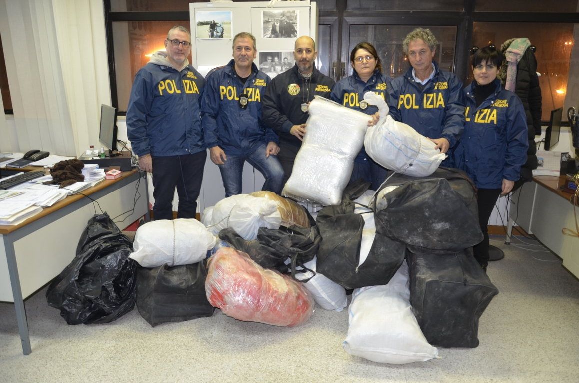 I due si erano acquattati dietro il muro di cinta del villino, nascondendo alcuni borsoni colmi di droga. Nonostante il buio fitto, gli agenti sono riusciti ad individuarli e a raggiungerli senza che i sospetti riuscissero a darsi alla fuga. La successiva ispezione del cortile del villino e delle aree immediatamente adiacenti ha consentito di rinvenire e sequestrare oltre 30 colli, stipati in grandi borsoni di tela del tipo da viaggio, che contenevano marijuana. I due sono stati quindi tratti in arresto per l’illegale possesso di quasi due quintali di droga; gli stessi si dicevano albanesi, privi di documenti di identificazione e validi per il regolare ingresso in territorio italiano, e dichiaravano di chiamarsi Tuni Marjol, 25 anni, e Neritan Lamaj, 32 anni.