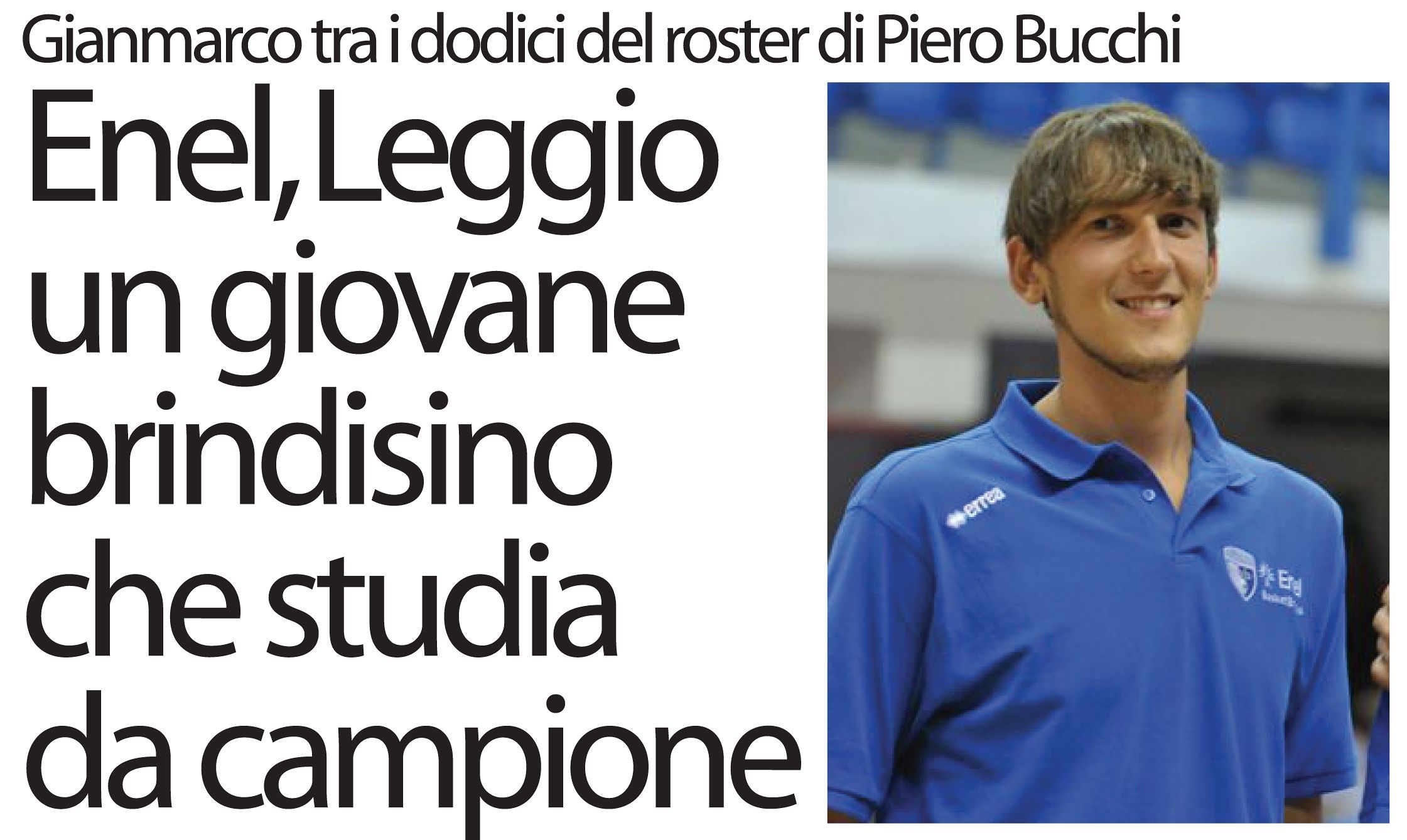 In questa società (dove è rimasto per quattro anni) è stato poi allenato da Gianfranco Patera, periodo in cui il pivot brindisino è stato riconosciuto come “mvp” con la rappresentativa regionale. Diciassette Leggio è poi approdato nella squadra “under 19” dell’Enel Brindisi di Giancarlo Giarletti, anno in cui è arrivato a Brindisi coach Piero Bucchi. Da allora Gianmarco Leggio è stato sempre in palestra con i “grandi” della prima squadra, in ritiro con loro a Cisternino, e lo scorso anno anche nelle fila dell’Eagles Brindisi in serie C/2 di Tonino Bray. Il contratto quinquennale con l’Enel gli è stato proposto ai primi del luglio scorso, ma fondamentale per Gianmarco ai fini della firma è stato il colloquio con Piero Bucchi: “Al suo fianco mi aspetto grandi miglioramenti sia dal punto di vista fisico che tecnico” ha confessato ieri mattina Gianmarco Leggio, in attesa del primo allenamento di atletica con la squadra al completo ieri pomeriggio (ore 18.30 di lunedì 26 agosto), sull’erbetta del Franco Fanuzzi. “E’ normale che spero di ricavarmi minuti in campo, ma già tutto questo è importante per me”.