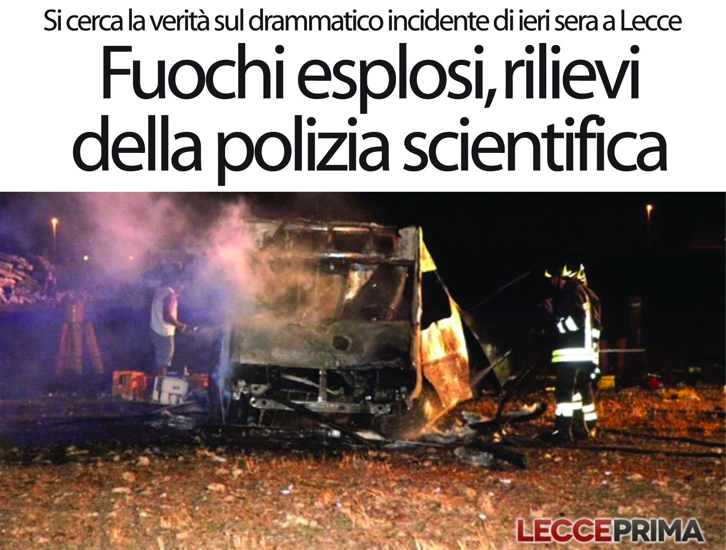 Sono ancora a lavoro gli agenti della polizia scientifica e i vigili del fuoco sull’area interessata dalla deflagrazione del furgone contenente i fuochi d’artificio, che erano pronti a regalare emozioni alla festa di S. Oronzo ieri sera a Lecce, provocando tre feriti di cui uno molto grave. La superficie, che si trova in via Potenza, contrada Masseria Grande a due passi dallo stadio di Via del Mare, è stata posta sotto sequestro. Alle indagini, coordinate dal sostituto procuratore Emilio Arnesano, partecipa anche lo Spesal, poiché l’episodio è stato collocato come un incidente del lavoro.