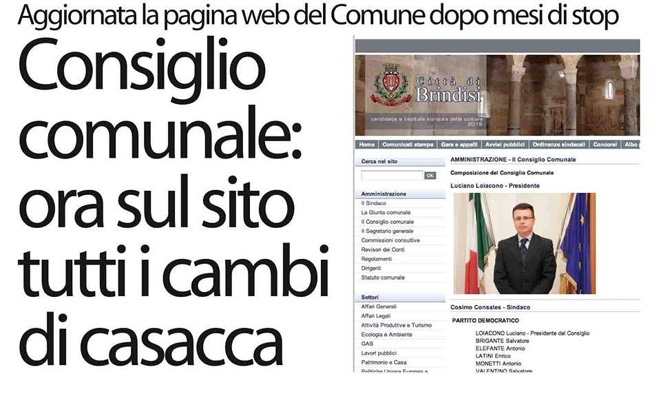 BRINDISI – L’ordine è ristabilito. La sezione del sito istituzionale del Comune di Brindisi riservata alla composizione del Consiglio comunale, ferma, inchiodata a quasi 3 mesi fa – così come segnalato ieri da Senza Colonne News – questa mattina è stata finalmente aggiornata. Tutti gli spostamenti dei vari consiglieri d’opposizione e maggioranza, i cambi di casacca, la comparsa e scomparsa d’interi partiti, i traslochi da un gruppo politico all’altro consumatisi nel corso dell’estate, non erano mai stati registrati sulla pagina istituita ad hoc.