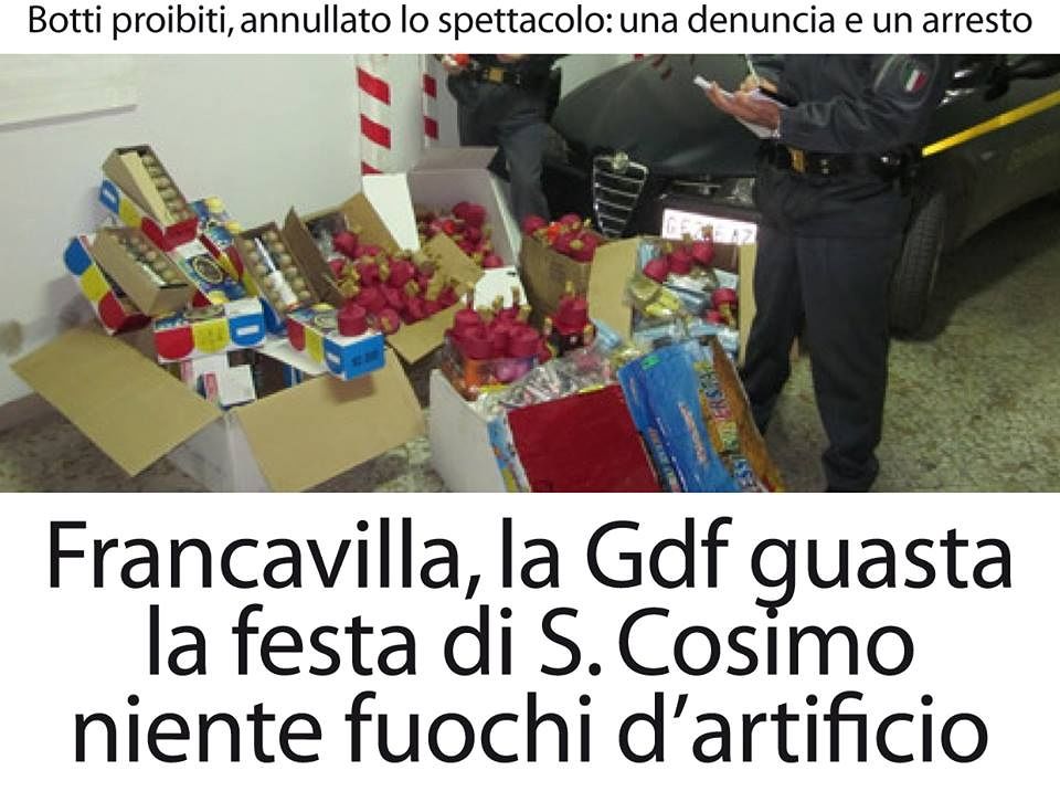 FRANCAVILLA FONTANA – Come se non fosse già sufficiente l’austerity imposta dalla crisi e dal commissario prefettizio, ci si mette anche la guardia di finanza a guastare l’estate ai francavillesi: mancava poco allo spettacolo pirotecnico, quando i 175 chili di fuochi d’artificio destinati a suggellare la festa di San Cosimo e Damiano, in contrada Cantagallo, sono stati sequestrati poiché illegali. Chi li doveva far esplodere non poteva – una denuncia e un arresto – e perfino l’evento non era stato affatto autorizzato. Le centinaia e centinaia di persone – fedeli e non – dopo aver partecipato alle celebrazioni religiose, si preparavano a gustarsi la fine dei festeggiamenti profani, fissata per le 23. Si aspettavano di chiudere la serata con il più classico dei “colpi scuri”, quelli che chiudono le batterie dei fuochi, ma si sono invece dovute rassegnare al blitz delle fiamme gialle di Francavilla – che hanno fermato un furgone con a bordo due uomini e un ingente quantitativo di botti. Erano destinati allo spiazzo retrostante la chiesa del Termitone, epicentro di una tra le feste rurali più sentite nella Città degli Imperiali. I fuochi erano privi di qualsiasi etichetta e i due fermati – il titolare di un’armeria del posto e un rivenditore di Bari – non erano in possesso di alcuna licenza per il trasporto e la stessa accensione degli esplosivi, perché di questo in fondo si tratta. Sono scattati una denuncia e un arresto, con beneficio dei domiciliari. Tanta la delusione dei contradaioli e della gente giunta dal centro e dai paesi limitrofi: finora non era mai successo che i Santi Medici fossero privati dei fuochi d’artificio. Risparmiare su questi articoli – è il messaggio implicito lanciato dai finanzieri – non è opportuno neppure in questi tempi di crisi. Uno spettacolo pirotecnico è qualcosa di delicato e pericoloso. Guastata la festa, gabbato lo santo.
