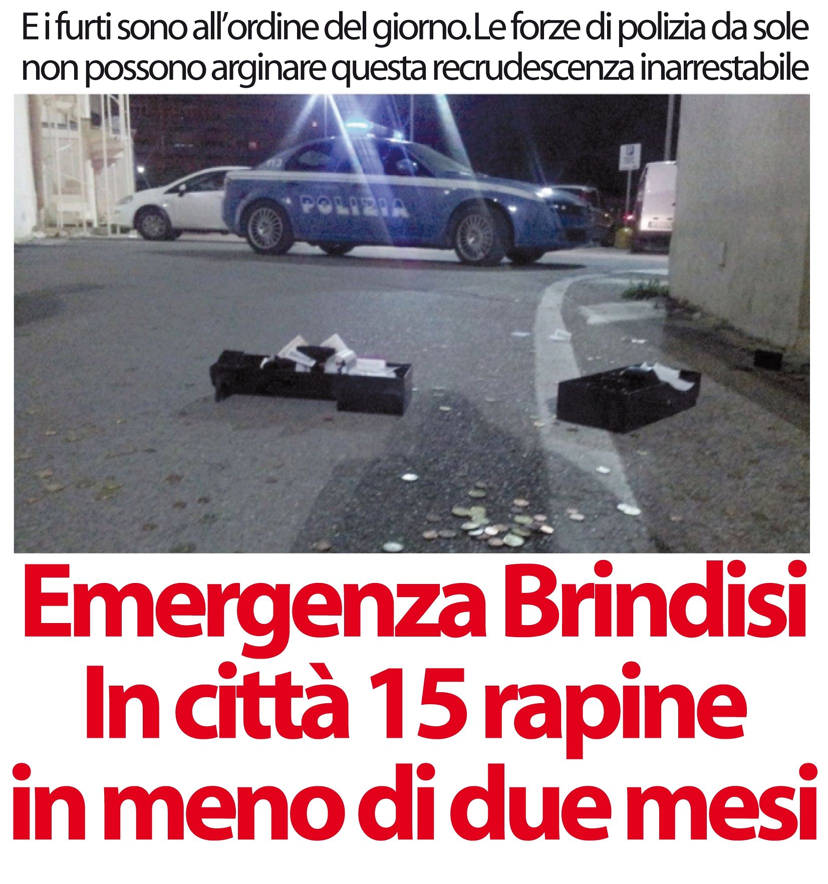 Il vero rischio è l’assuefazione, la resa, la disposizione d’animo a considerare tutto questo come “normale” e farci il callo. Ma non c’è nulla di “normale” in quello che sta accadendo da mesi a Brindisi. Quindici rapine in appena due mesi hanno poco di “fisiologico”, di statisticamente accettabile. Sono semplicemente troppe.