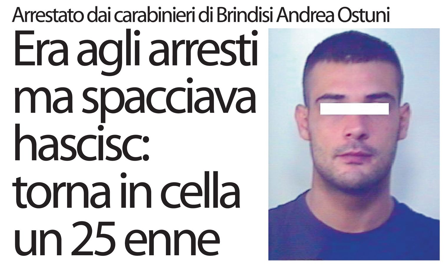 Era ai domiciliari ma deteneva in casa 72 grammi di droga del tipo hascisc: Andrea Ostuni 25enne di Brindisi è stato tratto nuovamente in arresto per detenzione ai fini di spaccio di sostanze stupefacenti. I carabinieri del Nucleo operativo e radiomobile della compagnia di Brindisi – guidati dal maggiore Cristiano Tomassini – hanno eseguito una perquisizione domiciliare presso l’abitazione di Ostuni dove hanno rinvenuto quasi cento grammi di droga, un bilancino di precisione e vario materiale utile per il confezionamento. Il tutto è stato sottoposto a sequestro e il 25enne è stato trasferito presso il carcere di Brindisi a disposizione dell’Autorità giudiziaria.