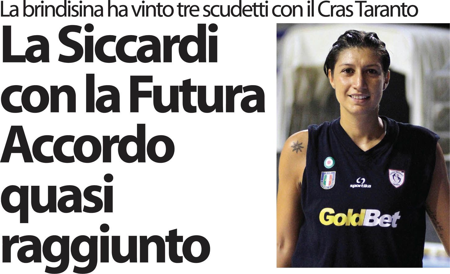 Manca soltanto la firma sul pezzetto di carta e poi sarà ufficiale il ritorno di Valentina Siccardi, ex capitano della Gold Bet Cras Taranto negli ultimi cinque anni, nella Futura Basket Brindisi dove l’ala guardia brindisina è cresciuta cestisticamente. “Siamo vicini ma non ho ancora firmato” è il commento immediato di Valentina Siccardi, 31 anni lo scorso 2 aprile, alta un metro e 80.