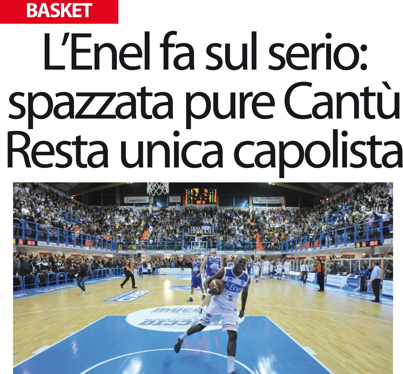Estasi biancazzurra. La New Basket Brindisi vince ancora e manda in delirio i 3500 del PalaPentassuglia e una città intera. Finisce 75 a 74 per gli uomini di Bucchi, che hanno la meglio sull’Acqua Vitasnella Cantù, al termine di una bellissima e spettacolare. “Oltre ogni limite” recitava lo striscione in curva e cosi è stato, l’Enel Basket è ancora la squadra da battere ed è ancora prima in classifica.