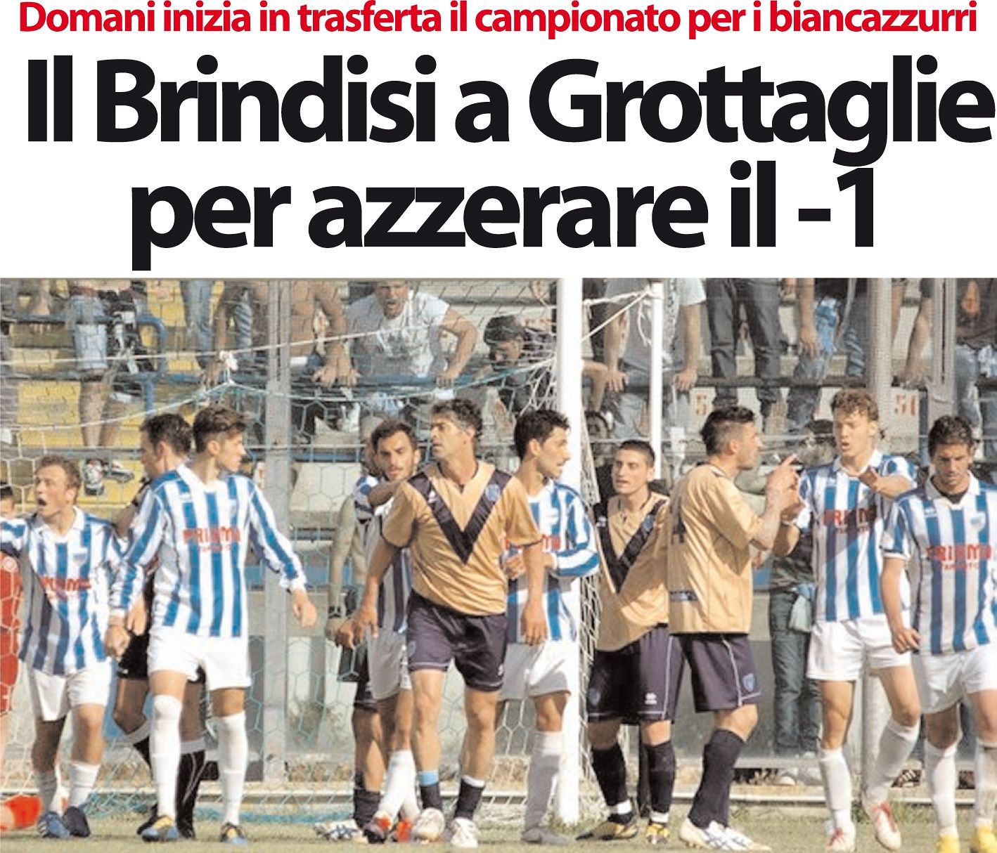 Va subito detto che il Grottaglie rappresenta una sorta di portafortuna per la Ssd Calcio Città di Brindisi, la società sorta nell’estate del 2011 sulle ceneri del Football Brindisi 1912, ed infatti tutte e quattro le volte in cui questa nuova società brindisina ha incontrato il Grottaglie ha sempre vinto, anche di goleada: nella stagione 2011/12, in trasferta, per 3 a 2, con reti biancazzurre di Prisco, Corvino e dell’immenso Nando Galetti, e 2 a 1 in casa, all’ultima di campionato, con le marcature di Corvino e Chianese che consegnarono ai ragazzi di mister Maiuri – nell’occasione con addosso una orrida maglia color oro con la V blu del tipo “Natale alla Standa”- la qualificazione in extremis ai play off; nella scorsa stagione, all’andata, vittoria interna per 5 a 0, con doppietta di Diego Albano e reti di Fusco, Rizzi e Laboragine, e successo in trasferta per 2 a 1, con marcature di Albano e dell’attuale capitano Mino Tedesco, nella gara di ritorno.
