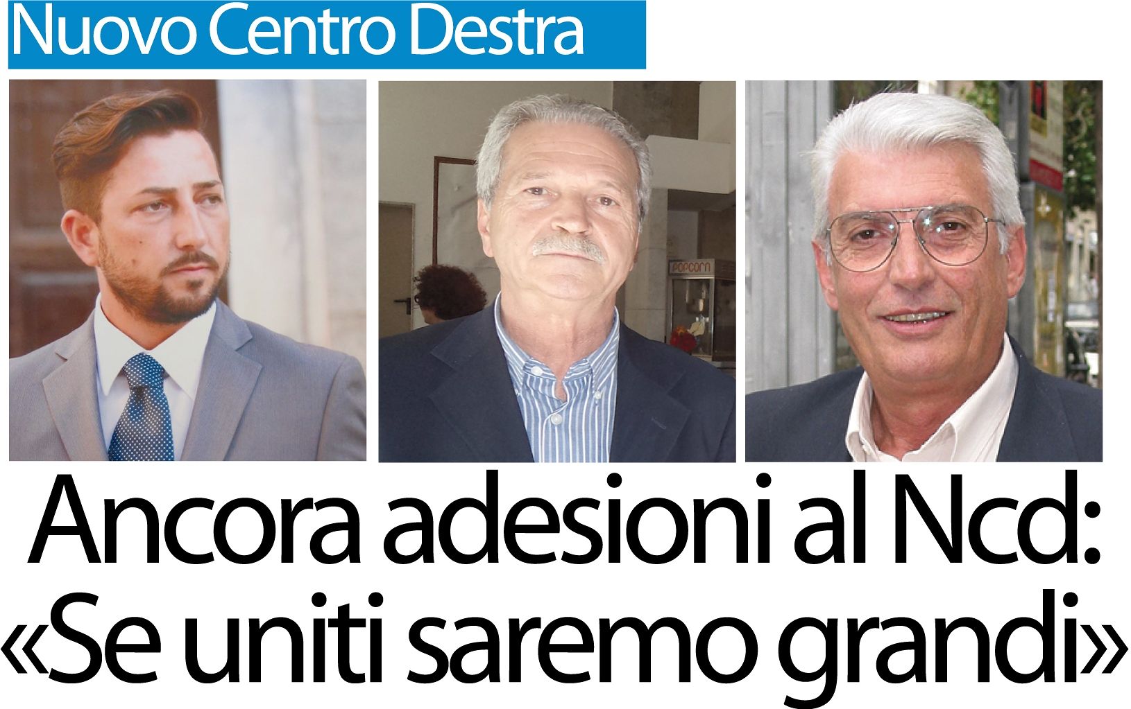Nelle stesse ore giunge anche l’adesione al Nuovo Centro Destra degli ex consiglieri provinciali di Noi Centro Giuseppe Iaia, Nuccio Della Rovere e Sergio Ciullo: “Daremo il nostro pieno appoggio e sostegno – fanno sapere – per far sviluppare in maniera ancora più forte questa nuova forza moderata che non può e non deve avere divisioni al suo interno, per essere la vera alternativa credibile agli estremismi che hanno bloccato la crescita del nostro Paese. Vediamo che la nostra sta diventando una grande forza politica con centinaia di amministratori in tutto il Salento e sicuramente ci saranno ulteriori margini di crescita. Saremo compatti e uniti contro coloro i quali tenteranno di creare inutili divisioni in questa che diventerà la più grande forza moderata del Paese”.
