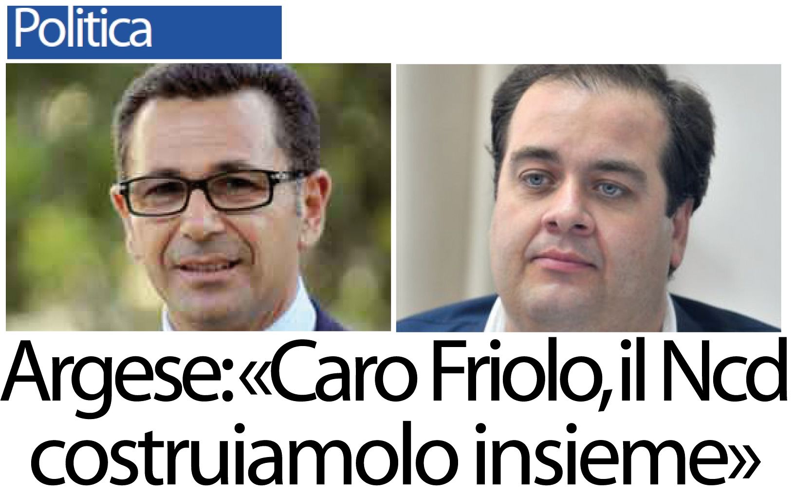 “Mi impegnerò con tutte le mie forze affinché si creino le condizioni, di comune accordo con l’amico Friolo, perché il Nuovo Centrodestra in Provincia di Brindisi parli la stessa lingua per essere insieme più forti”. E’ un messaggio di distensione quello che l’ex segretario provinciale dell’Udc Ciro Argese invia al consigliere regionale del suo stesso partito, il Nuovo Centro Destra, Maurizio Friolo. Parole che si rendono necessarie dopo che l’approdo nella stessa forza di pezzi da 90 della politica locale, ha alimentato il sospetto che nel nuovo partito si sia già cristallizzata attorno allo stesso Friolo una specie di corrente interna, composta in particolare da ex amministratori del Pdl. In realtà nel Nuovo Centro Destra non c’è nessuna divisione. Chi ne fa parte, ex pidiellini e uomini di centro e centrosinistra, erano fino a un mese fa rappresentanti del mondo moderato sparsi in altri partiti: perlopiù avversari.