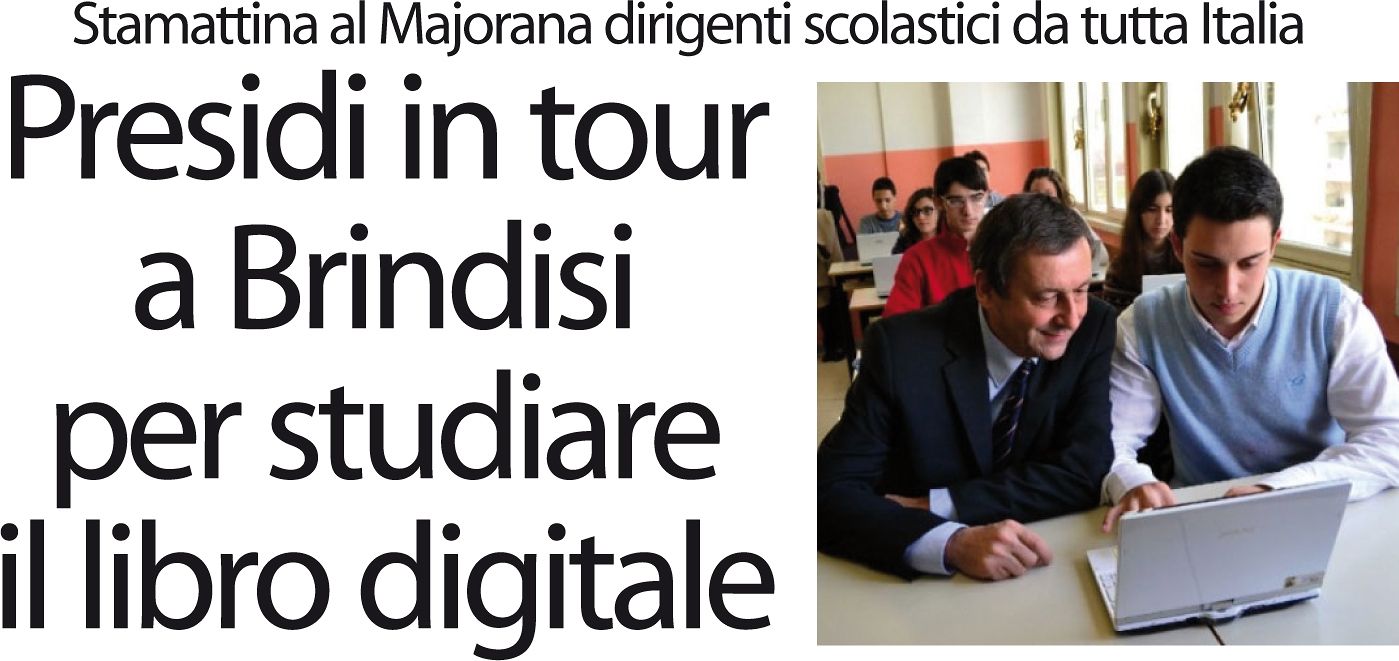 Dirigenti di tutta Italia questa mattina a Brindisi presso l’istituto scolastico Ettore Majorana per toccare con mano il progetto ideato dal liceo brindisino Book in Progress, dove i libri digitali sono già utilizzati da tre anni, con l’intento di portarlo nelle proprie scuole superiori e di 1° ciclo. Uno degli ultimi istituti italiani ad aver aderito al progetto di una scuola alla 2.0 è l’Itis “Manthonè” di Pescara che ha messo nella biblioteca scolastica tutti i libri scolastici, dando spazio agli iPad. I libri digitali pian piano stanno sostituendo i libri di testo classici.