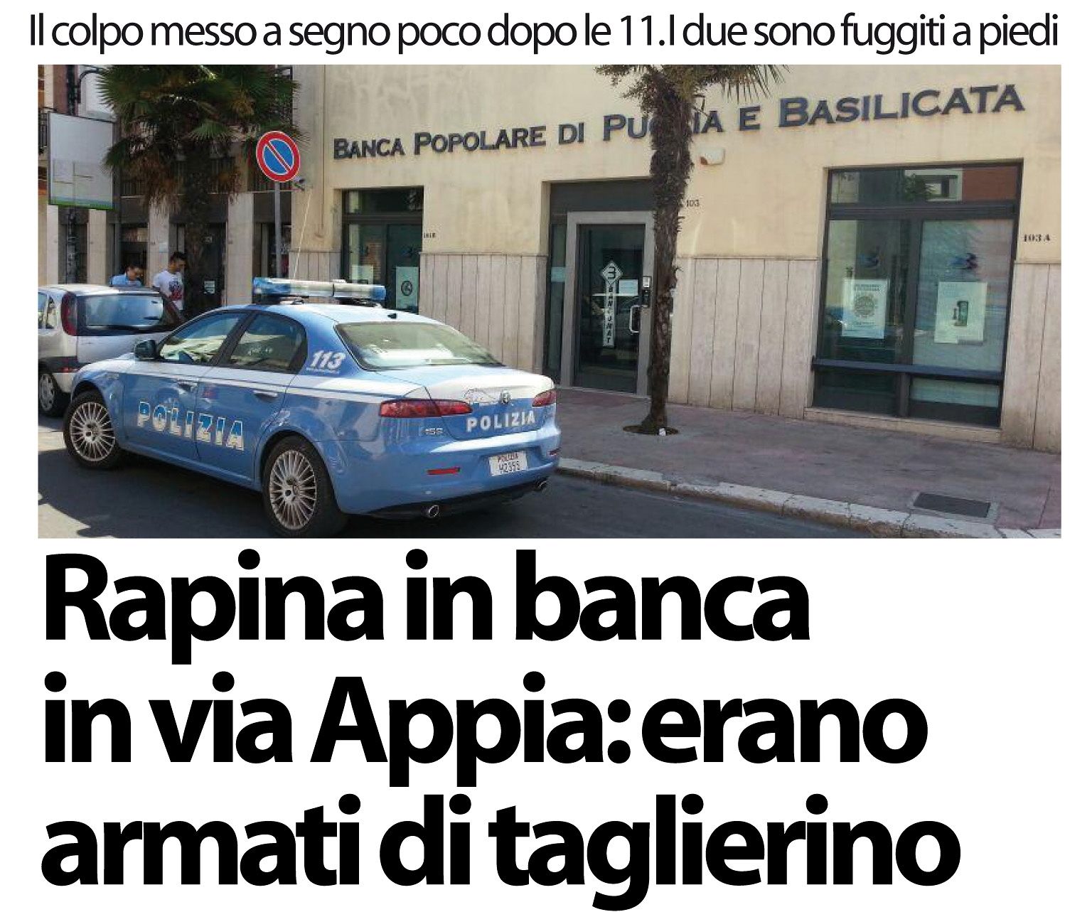 Due uomini armati di taglierino hanno fatto irruzione questa mattina nella filiale di Brindisi della Banca Popolare di Puglia e Basilicata, in via Appia. La rapina è stata messa a segno in pochi minuti, poco dopo le undici, sotto lo sguardo atterrito di clienti e impiegati. I due banditi, secondo le informazioni raccolte tra i testimoni dagli agenti della Sezione Volanti subito giunti sul posto, avrebbero agito a volto scoperto. Erano entrambi giovani, di età apparentemente compresa fra i 25 e i 40 anni, e indossavano jeans e camicia bianca. Stando a quanto ricostruito, una volta entrati in banca fingendosi comuni clienti, i due rapinatori hanno estratto i taglierini e aggredito gli impiegati agli sportelli, facendosi consegnare i contanti sotto la minaccia delle lame. Portato a termine il colpo i banditi hanno infilato l’uscita, fuggendo a piedi. Non è esclusa la presenza di un terzo complice in auto. Ancora in via di quantificazione l’ammontare del bottino. Le indagini sono condotte dagli investigatori della Sezione Volanti coordinati dal vicequestore Alberto D’Alessandro.