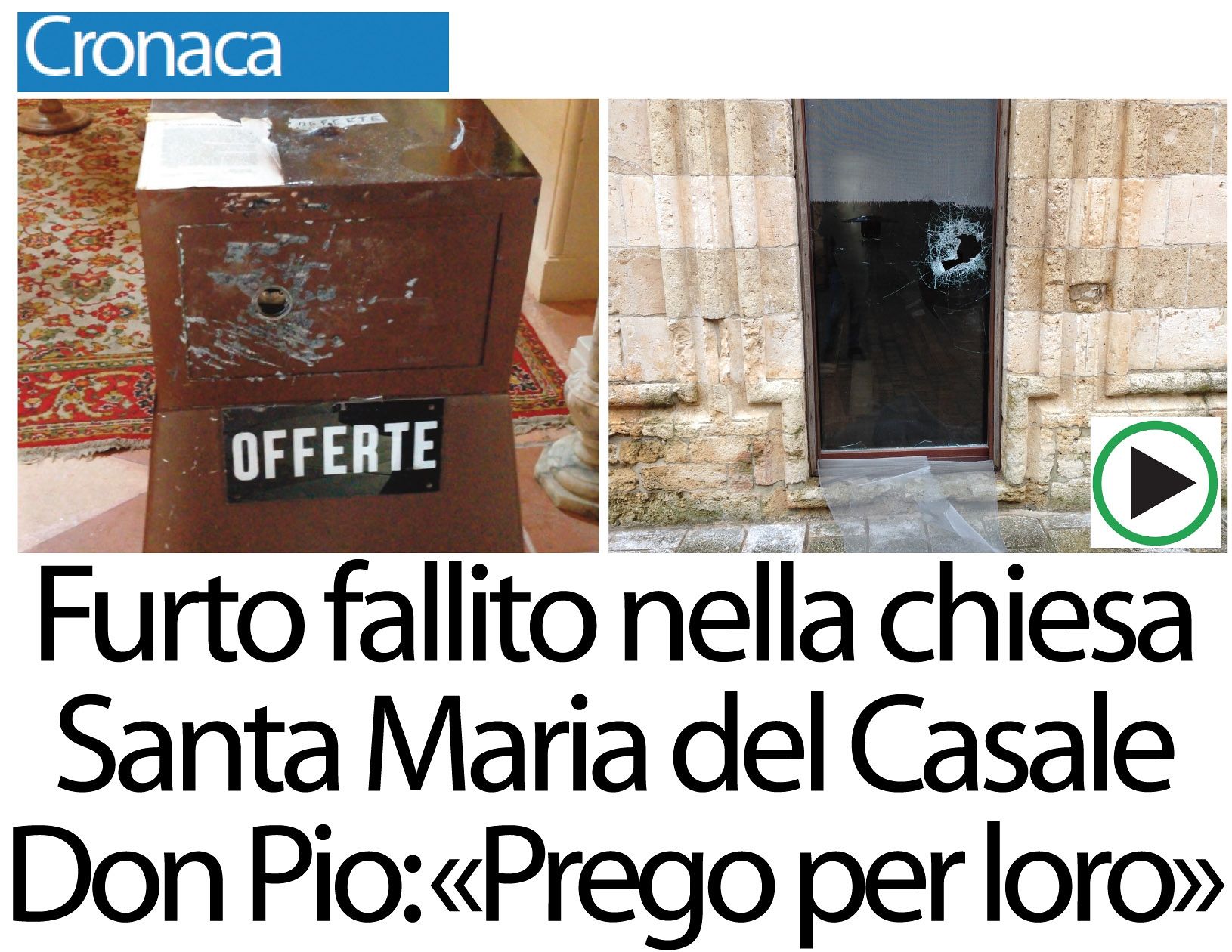 Per i credenti, se si vuole, una brutta storia in cui alla fine la divina Provvidenza ci ha messo del suo, salvando le offerte destinate a poveri e bambini dalle grinfie del demonio. Per i profani, solo l’ennesima prova che a Brindisi, mai come in questo periodo, la microcriminalità si dimostra sempre più scatenata, spavalda e sprezzante: anche dei luoghi sacri. E dei giorni sacri.