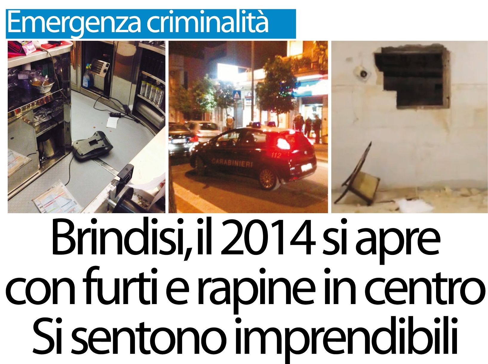 Annuo nuovo, stesse piaghe. Il 2013, per Brindisi, è tramontato trascinandosi dietro, nel suo ultimo scorcio, una coda di furti e rapine senza precedenti nella sua storia più recente. Quello nuovo, il 2014, albeggia nel segno della continuità. La criminalità che dalla fine dell’estate saccheggia a piene mani il ventre produttivo della città e della provincia, continua a far paura, a rubare, a depredare senza sosta e ritegno. Lo fa con una spavalderia che ha il suono di un guanto di sfida scagliato in faccia alle istituzioni e alle forze dell’ordine. La novità del nuovo anno è quella dei colpi in centro.