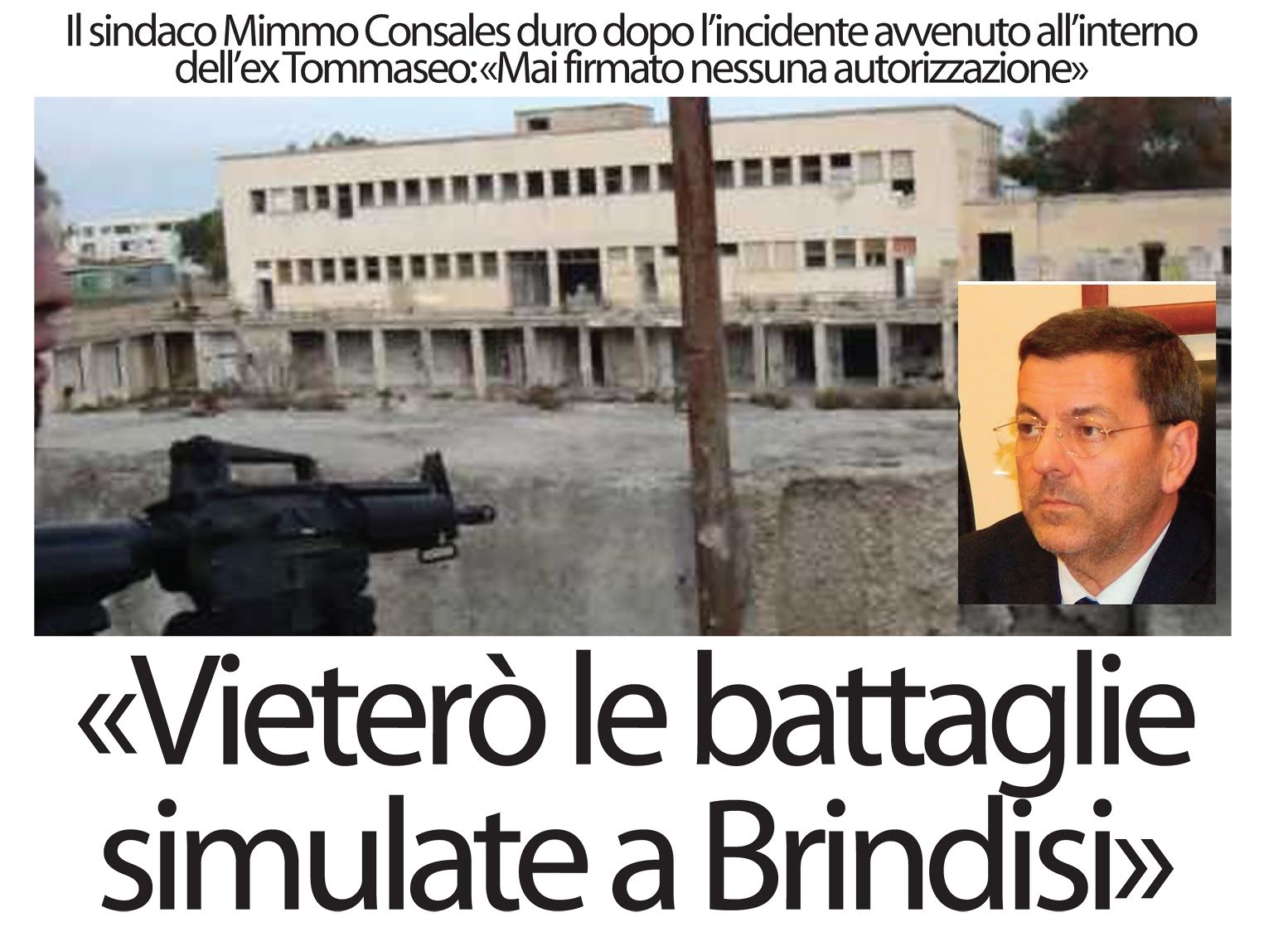 “Non ho firmato nessuna autorizzazione e mai ne firmerò per consentire le esercitazioni di softair. La battaglia simulata, che si è tenuta lunedì pomeriggio nel collegio Tommaseo da un gruppo che pratica questo sport, era totalmente abusiva. Sto pensando seriamente di presentare denuncia”. Sono le parole del sindaco Mimmo Consales dopo l’incidente avvenuto nello spazio verde che costeggia via Amerigo Vespucci dove è rimasto ferito un 45enne brindisino.