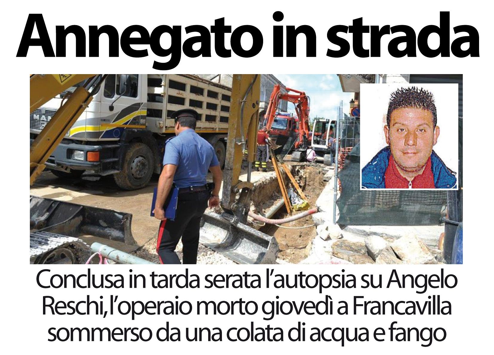 Angelo Reschi, l’operaio 38enne travolto da una colata d’acqua e fango giovedì mattina a Francavilla Fontana durante i lavori di sostituzione di una condotta dell’Aqp, è morto per asfissia da annegamento. E’ quanto emerge dall’autopsia sul corpo della vittima conclusa poco dopo le 22 dal medico legale Antonio Carusi. I risultati dell’esame confermano, quindi, quelli della prima ispezione cadaverica effettuata poche ore dopo la tragedia.