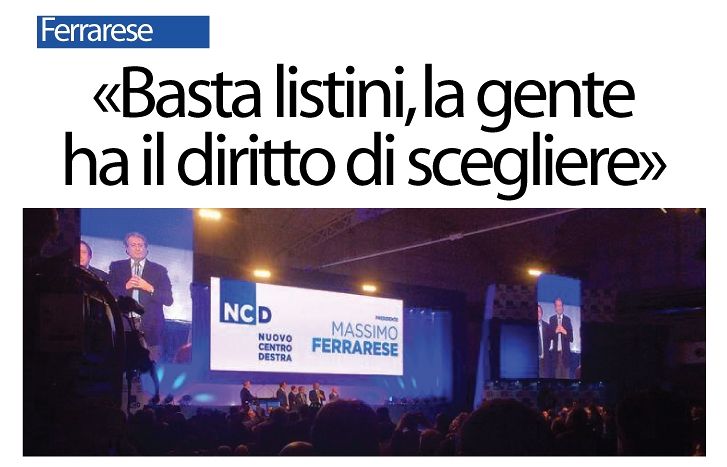 “I cittadini non vogliono più sentir parlare di listini o listoni bloccati ma eleggere e scegliere il proprio rappresentante in Parlamento”. E’ quanto dichiarato dal responsabile del Nuovo Centrodestra per il Salento, Massimo Ferrarese, a margine dell’incontro tenutosi questa mattina a Roma con tutti i coordinatori regionali del partito. “A nulla serve – ha detto Ferrarese – cambiare una legge se si tralascia la parte più importante e cioè la necessità, da parte dei cittadini, di poter scegliere i propri rappresentanti in Parlamento. Sappiamo che per il resto la legge va bene a tutti e che poco o nulla importa alla gente delle percentuali di sbarramento, ma votarla senza preferenze, cosi come proposta da Renzi e Berlusconi, è una grande presa in giro e un ritorno al passato dando la possibilità a pochi intimi di decidere sulla testa degli italiani. Se continuassero – ha concluso Ferrarese – a giocare contro la chiara volontà di tutti, sia chiaro, saremmo tutti al fianco del Presidente Alfano per una grande battaglia”.