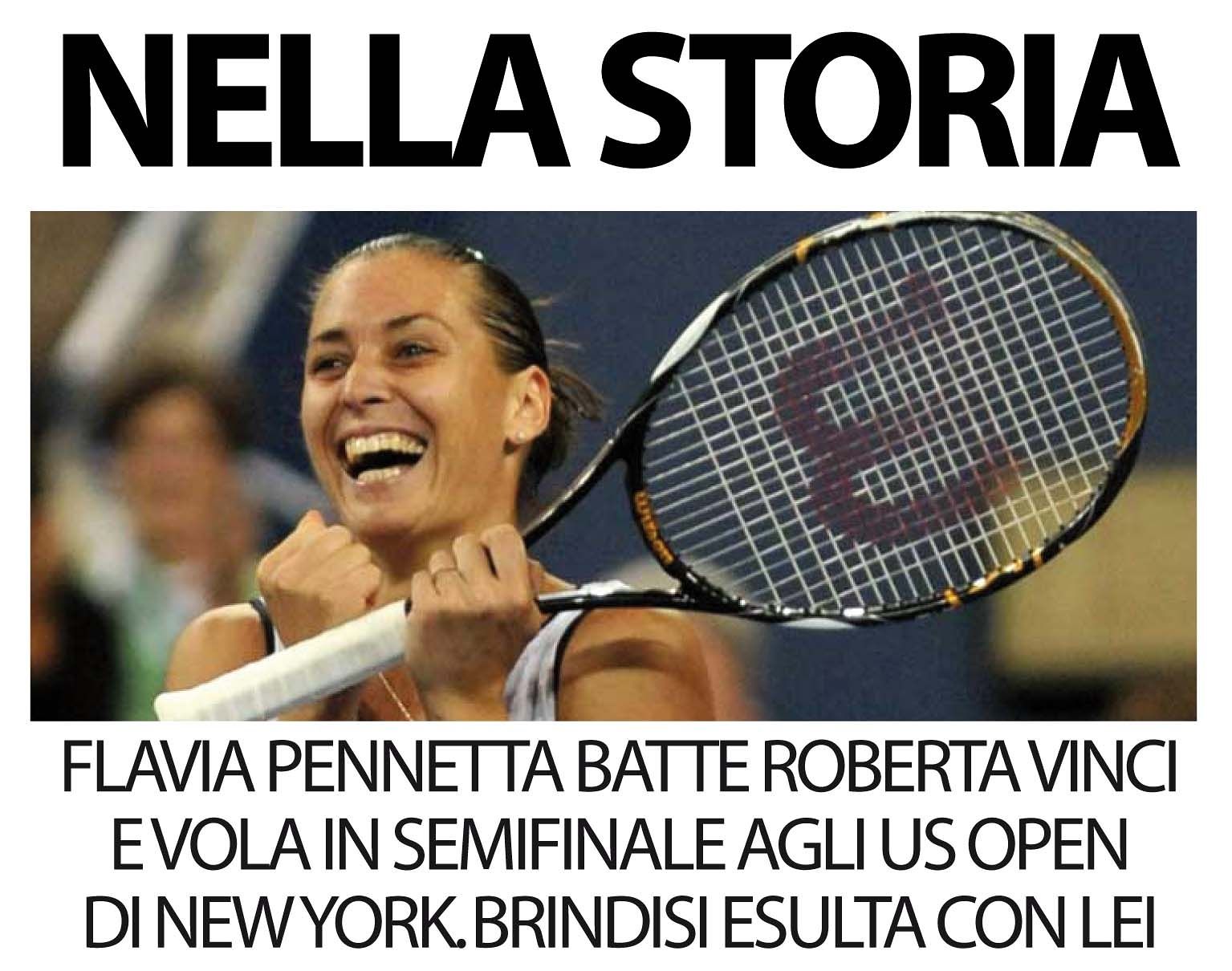 Flavia Pennetta vince facilmente il quarto tutto azzurro con Roberta Vinci, testa di Serie numero 10, agli Us Open femminili. La brindisina si e’ imposta pet 6-4 6-1 conquistando cosi’ la sua prima semifinale nello Slam americano. “Sono contentissima, non riesco a crederci – ha detto a caldo – E’ stato difficile giocare con Roberta, non ti manda mai una palla uguale all’altra, ma forse ha pagato un po’ la tensione. Questa e’ la prima settimana, dall’operazione al polso, in cui mi sento una giocatrice migliore giocatrice”.Grande entusiasmo al Circolo tennis di Brindisi dove la partita è stata seguita sul maxischermo. «A Flavia Pennetta e a Roberta Vinci un grandissimo abbraccio. Riempite di orgoglio tutti noi pugliesi!». Lo scrive su twitter il presidente della Regione Puglia Nichi Vendola.