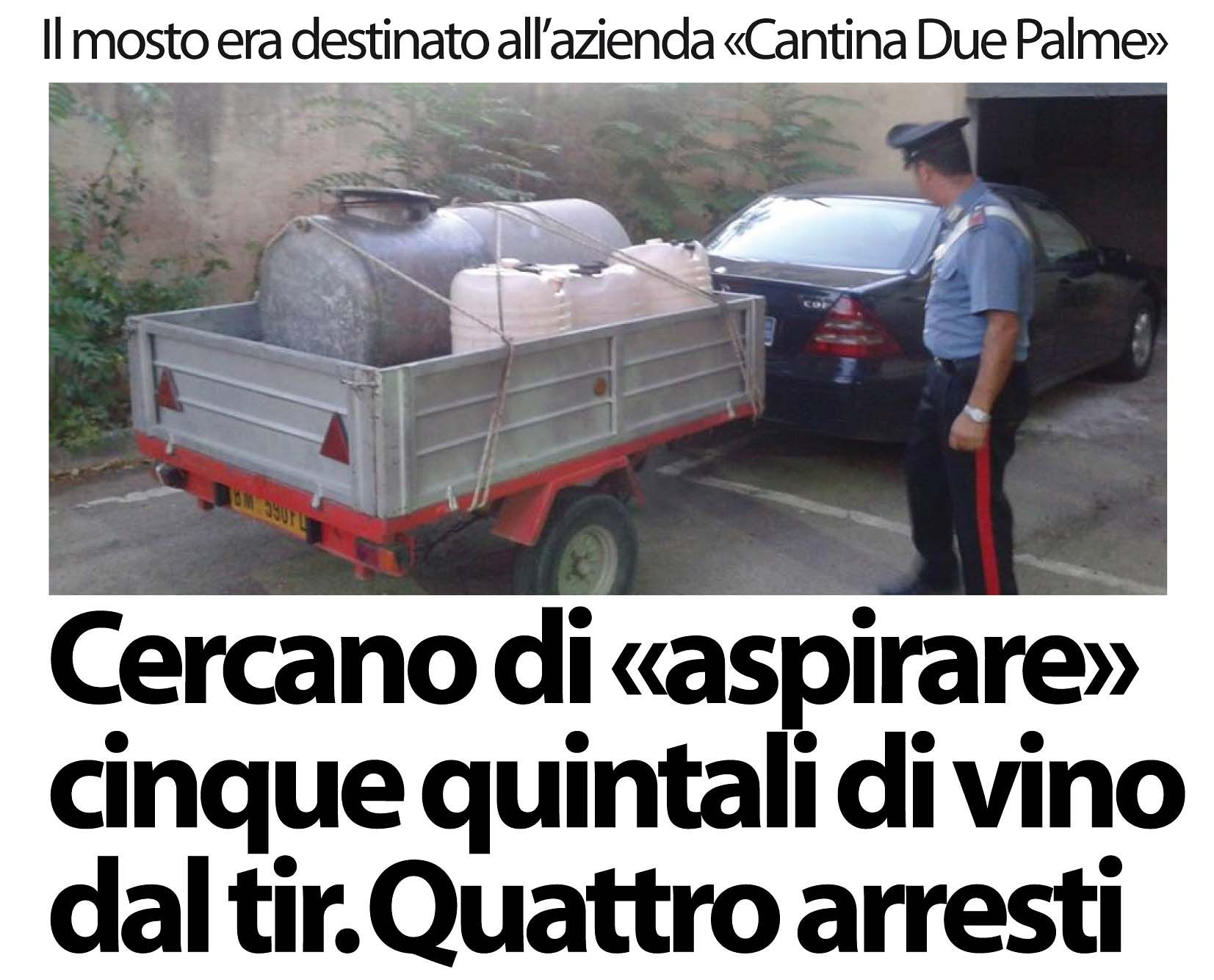 Da Villa Castelli a Cellino San Marco, – per trasportare 280 quintali di mosto all’azienda vitivinicola di Angelo Maci “Cantine Due Palme” – con fermata “tecnica” a metà strada, precisamente in contrada Monti a Torre Santa Susanna per asportarne ben 5 quintali. Con l’accusa di furto aggravato in concorso sono stati arrestati in flagranza quattro uomini di Villa Castelli: Francesco Giovanni Trinchera di 55anni, Angelo Vitale di 59 anni, Luigi Ligorio di 62 e Cosimo Ligorio 34enne.
