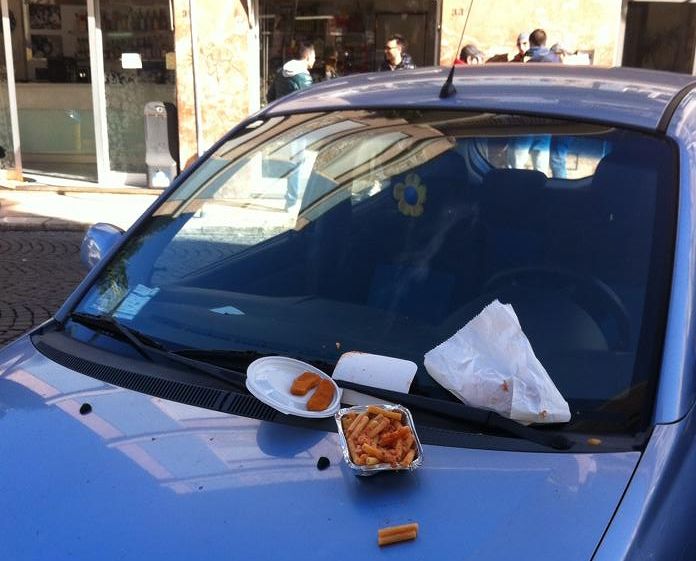 IL PASTO DELLA CARITAS NON E’ GRADITO E LO BUTTANO SULL’AUTO IN SOSTA