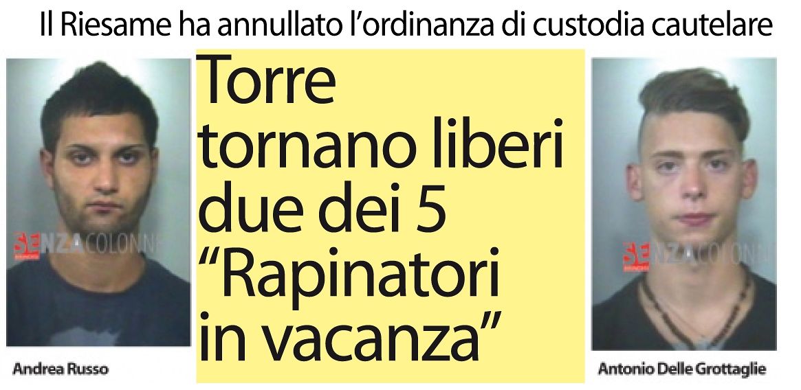 Sono tornati in libertà due dei cinque presunti rapinatori di Torre Santa Susanna arrestati il 26 agosto dai carabinieri a Ponsacco (Pisa). Si tratta di Andrea Russo, 21 anni, difeso dall’avvocato Giuseppe Pomarico (che assiste anche il fratello di Russo, Damiano), e di Antonio Delle Grottaglie, 18 anni, difeso dall’avvocato Sandra Melillo. Il tribunale del Riesame ha revocato l’ordinanza di custodia cautelare emessa nei loro confronti dal gip, anche se non si conoscono ancora le motivazioni della decisione: entrambi i giovani sono incensurati e le loro posizioni risultano meno pensanti rispetto a quelle degli altri tre. Manuel Camarda, 27enne, Nicola Totaro, 30enne e per l’appunto Damiano Russo, 30enne, sono tuttora in carcere.