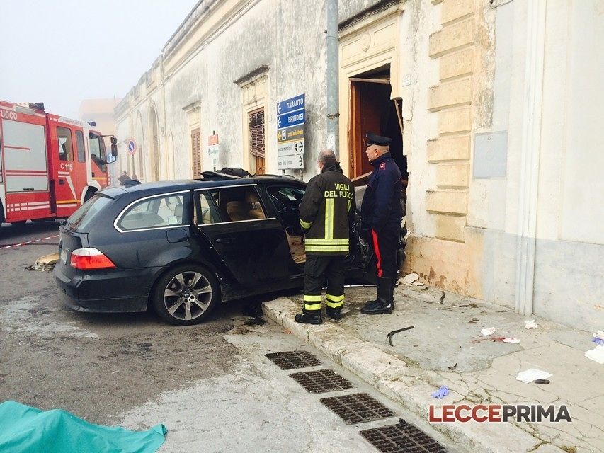 Drammatico incidente all’alba nel centro di Surbo: due giovani hanno perso la vita e altri due sono rimasti feriti. Una Bmw Station Wagon, forse a causa della nebbia, è finita dentro un’abitazione in via Lecce, la strada principale del paese, finendo la corsa nella camera da letto. Due ragazzi sono morti sul colpo, gli altri due sono stati soccorsi dal 118. L’anziana che vive in casa si trovava in un’altra stanza. Carabinieri e vigili del fuoco stanno operando per identificare vittime e feriti.L’incidente è avvenuto poco dopo le 5 di questa mattina.